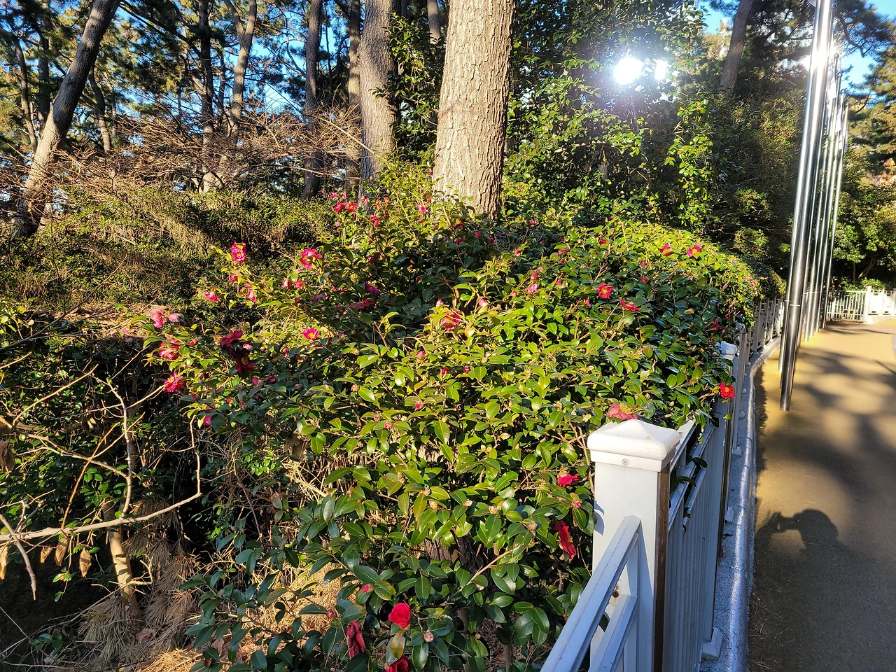 나는 소나무에서 드리워진 그림자를 밟으며 계단을 올라가는데 근처 곳곳에 동백꽃이 붉게 피어 있다.
