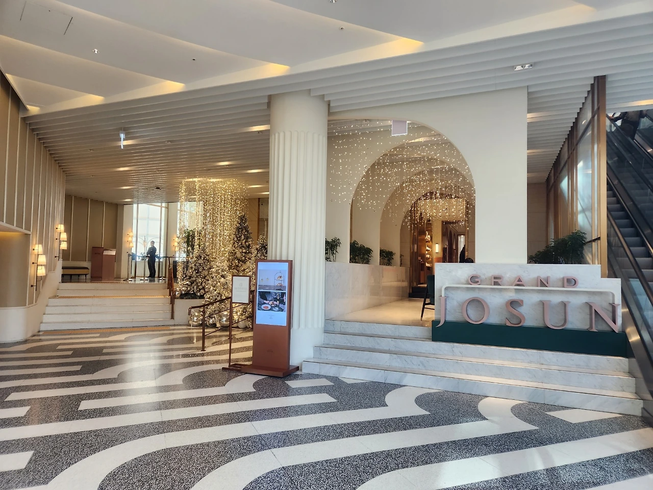 깨끗한 남색 유니폼을 입은 직원의 인사를 받으며 유리로 된 1층 분 입구로 들어간다. 내부는 전체적으로는 화이트로 단정하고 절제된 분위기가 풍기는데 로비에서 오른쪽으로 가면 감성 조명이 있다. 포토존이라고 적혀 있는데 호텔에 자주 오지 않는 나 같은 사람은 이런 날 제일 좋은 옷을 입고 와서 사진을 남기는 것도 하나의 재미다.