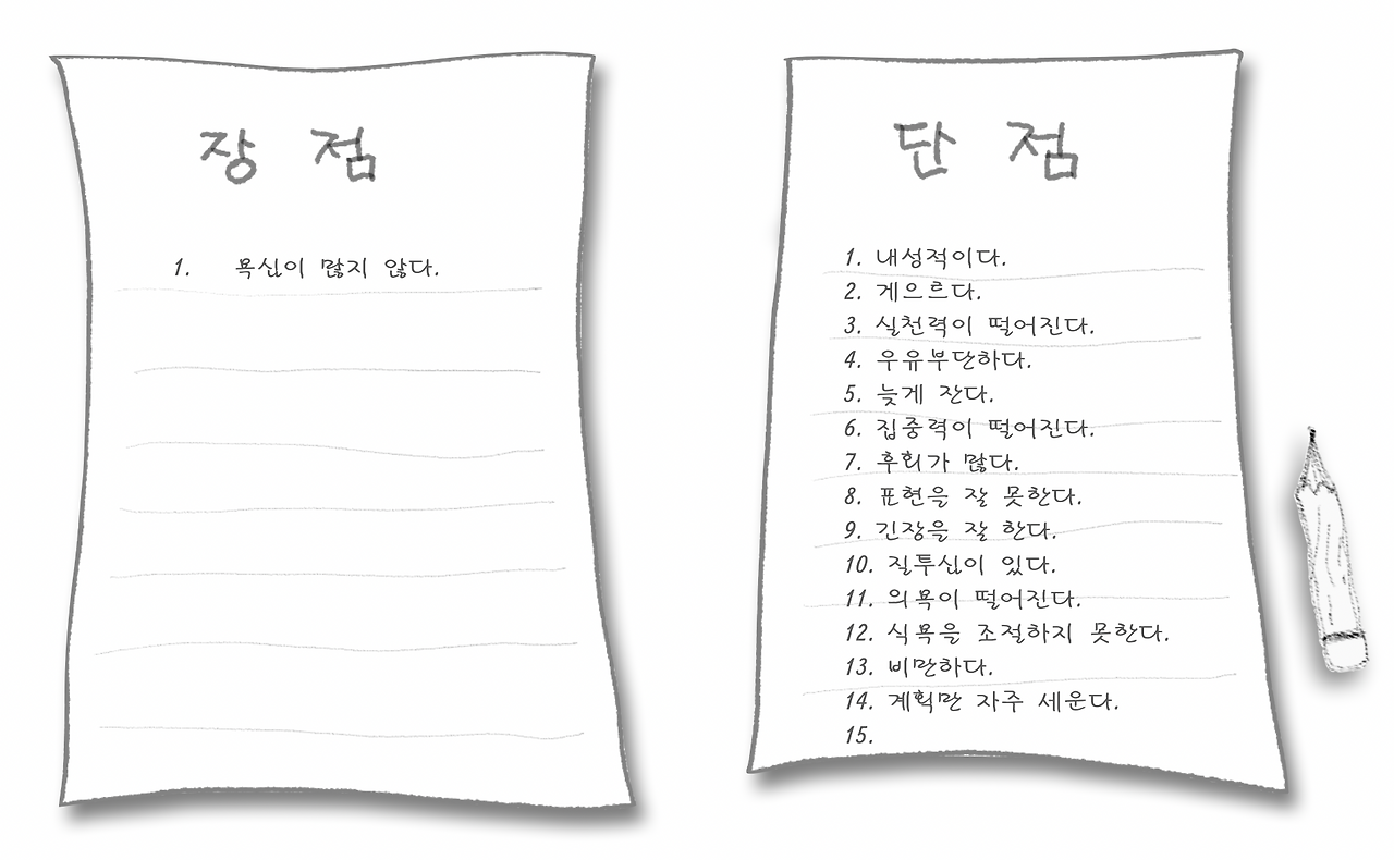 만약에 '자신의 단점만을 5가지 이상 적어 보세요' 였다면, 얼마나 수월했을까요? 단점은 순식간에 적었습니다. 단 한 명의 예외도 없었습니다. 어떤 분들은, 페이지 뒤편까지 20개 이상을 빛의 속도로 적어 내려갔습니다.