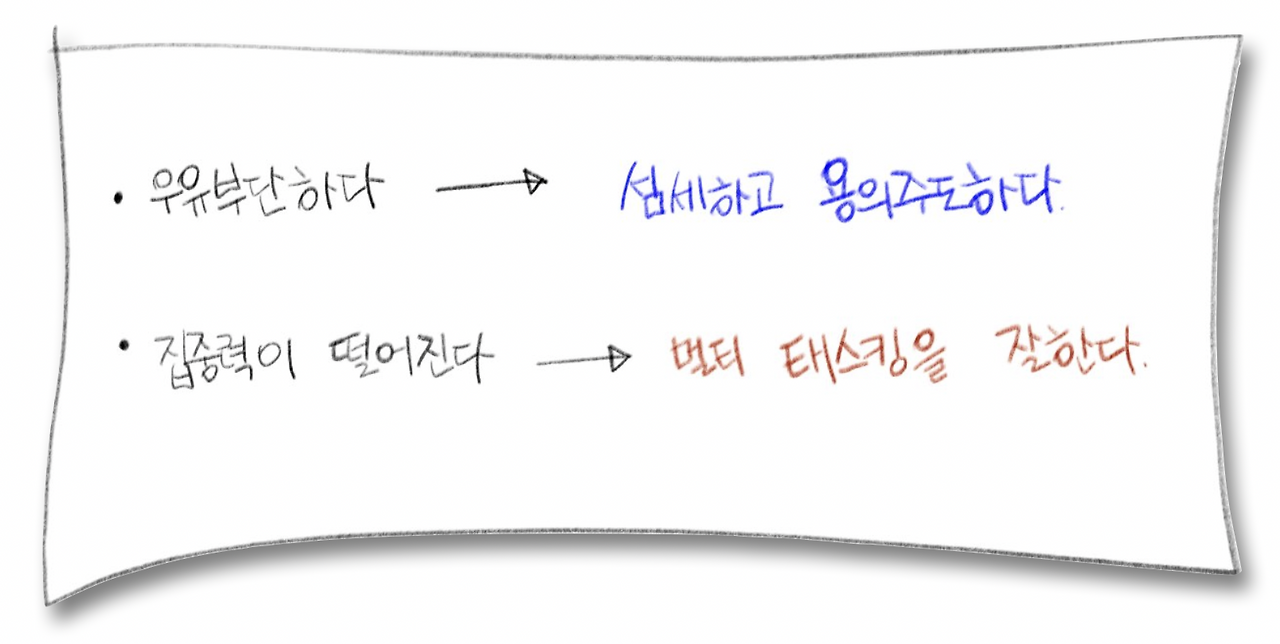 예를 들어, '우유부단하다'는 '섬세하고 용의주도하다'라고 말입니다.