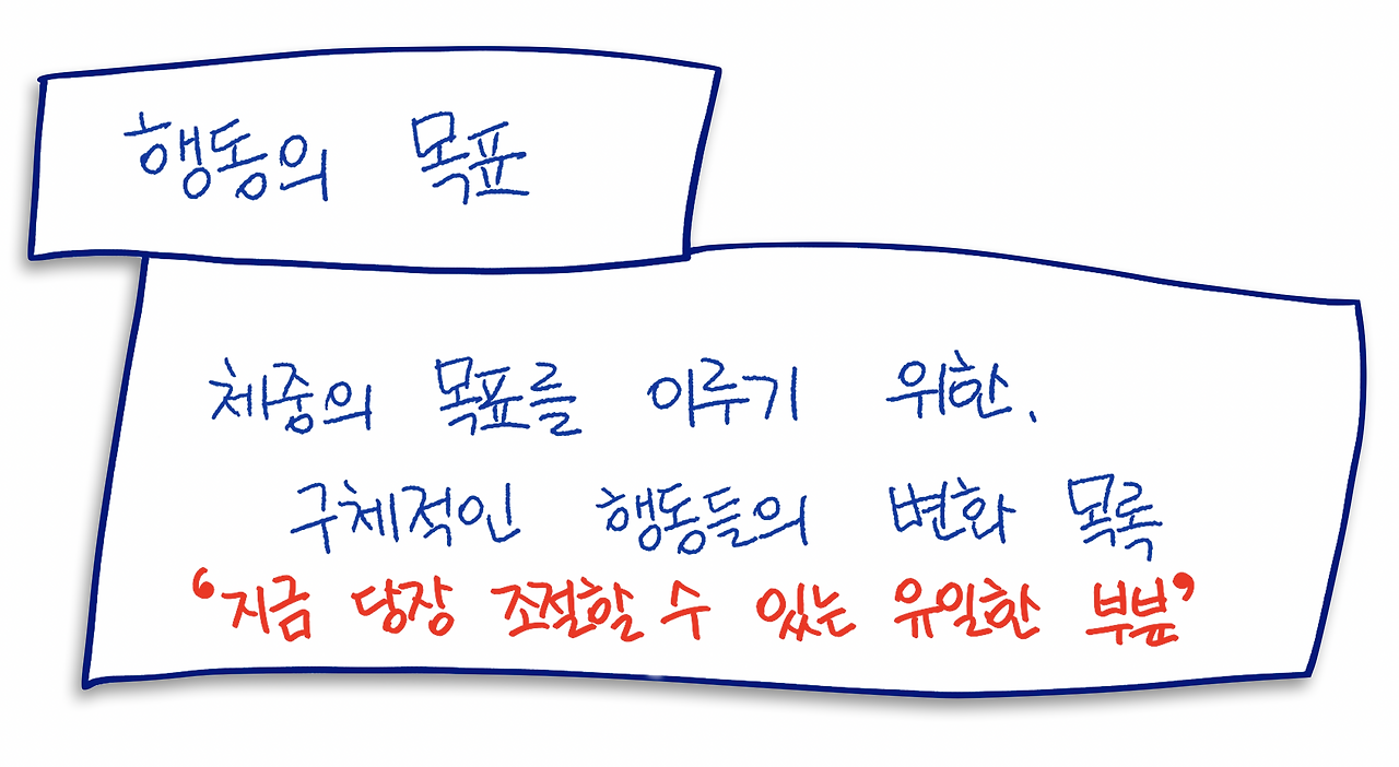 위에 적은 체중의 목표를 이루기 위한, 나의 행동의 변화 목록입니다. 우리가 지금 조절할 수 있는 부분은, 바로 이 '행동의 목표' 뿐입니다. 지금까지 먹어왔던 식사패턴으로는 절대, 위에 적어 내려간 체중의 목표를 이룰 수 없습니다. 지금까지 움직였던 활동량으로는 절대, 위의 체중의 목표를 이룰 수 없습니다. 내 하루 일상생활에서의 아주 작은 변화까지도 생각해보고, 따져 봐야 합니다. 당장 내가 달라질 수 있는, 내가 달라져야 하는 구체적인 행동들 목록을 만드는 것입니다. 2-3가지 일 수도 있고, 10가지가 넘을 수도 있습니다. 야식이 많은 사람이라면, 잠자는 시간대를 당기는 노력도 필요할 수 있고, 전혀 운동을 안 하던 사람이라면 당장 집에서 요가나 줄넘기를 시작하는 노력이 필요할 수도 있고, 빵과 단 음식을 많이 먹던 사람이라면 밥으로 식단을 개선하는 노력이 필요할 수도 있습니다. 내일부터라도 바로 시작할 수 있는 행동들, 즉 위에 적은 목표 체중을 이루기 위한 행동의 변화들 또는 새롭게 시작해야 할 행동들을 샅샅이 적어 봅니다. 이 행동의 목표는 아주 현실적이고, 구체적이고, 실제적이어야 합니다.