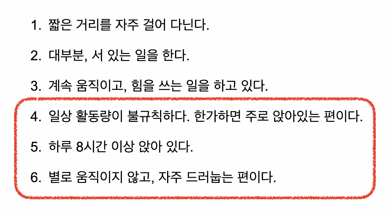 옆의 항목도 참고하셔서, 운동 계획을 세워 보세요. 만약, 4~6번에 모두 해당되신다면,