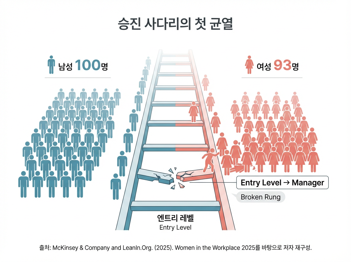 최근의 연구와 보고서들은 이 문제를 꽤 선명하게 드러냅니다. 여성의 승진 사다리를 분석한 2025년 Women in the Workplace 보고서는 가장 첫 번째 관리직 승진 단계에서부터 균열이 시작된다고 지적했습니다. 남성 100명이 관리자 승진을 할 때 여성은 93명에 그쳤고, 그 격차는 이후 상위 단계로 갈수록 누적됩니다.