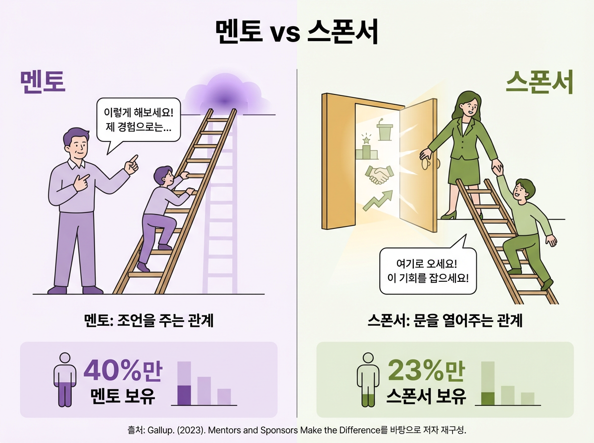 Gallup은 멘토와 스폰서의 차이를 명확히 구분합니다. 멘토는 방향을 조언하고 성장을 돕는 사람이고, 스폰서는 기회의 문을 실제로 열어주는 사람입니다. Gallup 자료에 따르면 직장에서 멘토가 있다고 답한 직원은 40%, 스폰서가 있다고 답한 직원은 23%에 불과했습니다. 또한 멘토나 스폰서가 있는 직원은 그렇지 않은 직원보다 자기 조직이 자신의 경력개발 계획을 분명하게 제시한다고 느낄 가능성이 두 배 이상 높았습니다.