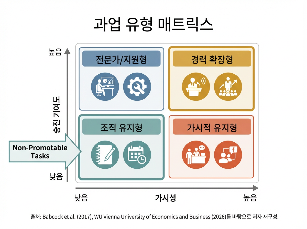 2026년 빈경제경영대학교(WU)의 최근 연구 소개도 비슷한 방향을 보여줍니다. 해당 연구에서는 팀 운영과 조직 유지에 필요한 자발적 추가 업무를 “office housework”, 전략적이고 눈에 띄는 고가시성 과제를 “office glamour work”로 구분하면서, 여성들이 전자에는 거의 두 배 가까이 더 많이 관여하고 후자에는 약 3분의 1 덜 관여하는 경향이 있다고 설명합니다. 더 문제가 되는 것은 평가 방식입니다. 같은 조직 유지형 과업을 수행해도 남성이 더 많은 인정을 받는 반면, 여성은 커리어에 도움이 되는 전략 과제에 들어갈 기회를 덜 얻는다는 점이 지적됩니다.