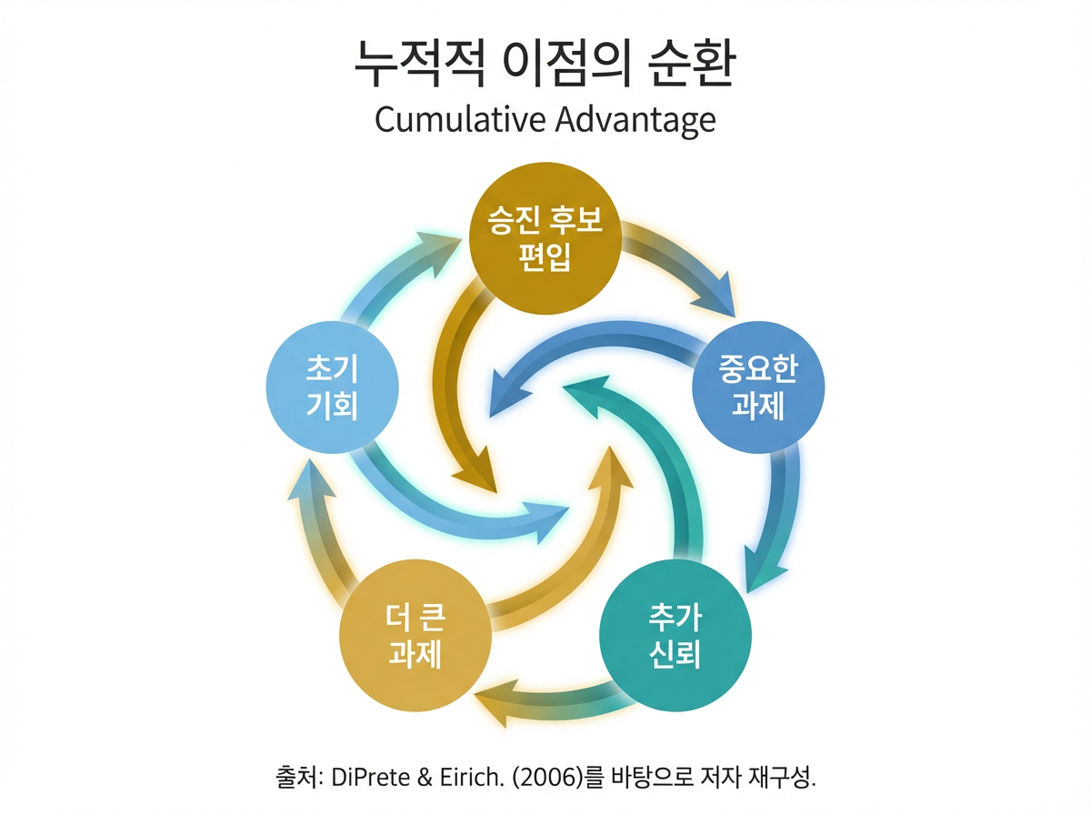 사회학에서는 이를 누적우위(cumulative advantage)의 문제로 설명해 왔습니다. DiPrete와 Eirich는 누적우위를, 처음의 상대적 이점이 시간이 지날수록 추가 이득을 낳아 격차가 더 커지는 메커니즘으로 정리했습니다. 처음에는 작은 차이처럼 보이더라도, 그 차이가 더 좋은 자원, 더 많은 인정, 더 넓은 기회로 이어지면 이후의 결과는 훨씬 더 벌어진다는 설명입니다. 이 메커니즘은 교육, 소득, 지위뿐 아니라 커리어와 조직 내 불평등을 이해하는 데에도 널리 활용됩니다.