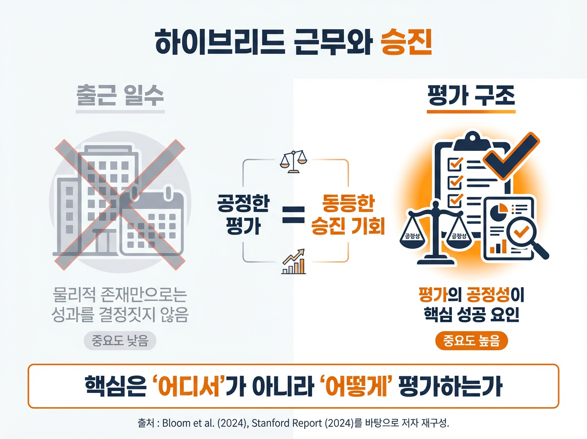 이 결과가 중요한 이유는 단순히 “재택해도 괜찮다”는 결론 때문이 아닙니다. 더 중요한 것은 가시성의 문제도 결국 평가 구조에 의해 달라진다는 점입니다. 즉, 사람들은 흔히 물리적 근접성만으로 승진이 결정될 것이라 생각하지만, 실제로는 조직이 어떤 방식으로 성과를 기록하고, 누구에게 어떤 과업을 배정하며, 승진을 어떤 기준으로 판단하느냐에 따라 결과가 달라집니다. 하이브리드 환경에서도 평가 구조가 안정적으로 설계되면 승진 격차가 반드시 커지는 것은 아닙니다. 반대로 사무실에 항상 보이는 환경이라도, 전략 과제가 편중되고 후원 구조가 닫혀 있으면 특정 사람에게만 기회가 몰릴 수 있습니다.