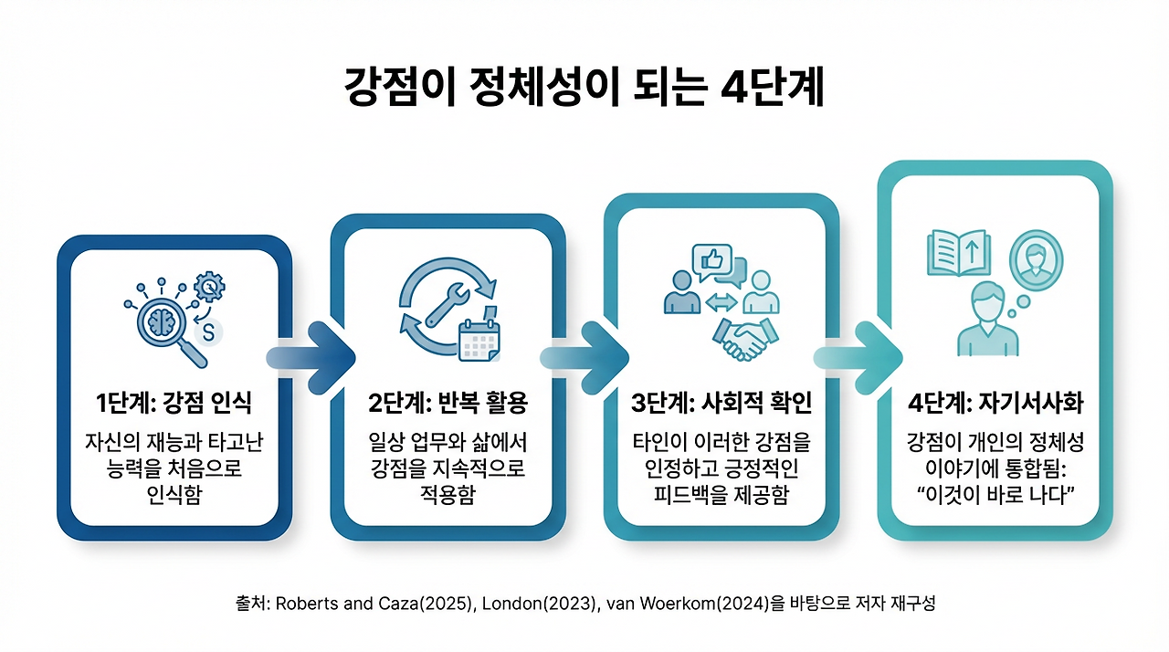강점은 처음부터 고정된 정체성이 아닙니다. 그것은 반복 수행, 자기 인식, 타인의 확인, 시간적 연결을 거치며 정체성으로 굳어집니다. 어떤 사람은 잘하는 일이 있어도 그것을 자기 정체성으로 연결하지 못하고, 어떤 사람은 작은 강점을 점차 자기 이름의 일부로 만듭니다. 결국 차이는 능력의 존재만이 아니라, 그 능력이 어떻게 자기 개념 속에 자리를 잡는가에서 벌어집니다. 자기 인식 연구와 긍정적 정체성 형성 연구는 모두 이 점을 뒷받침합니다.