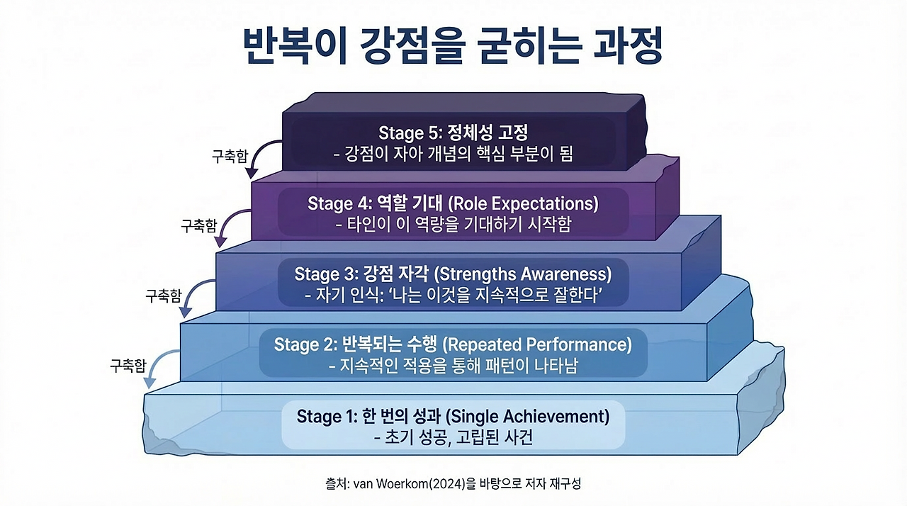 2024년 강점활용(strengths utilization) 연구는 이 반복의 힘을 잘 보여줍니다. van Woerkom은 강점의 두드러짐(strengths prominence), 강점 인식(strengths awareness), 강점 활용(strengths use), 강점 개발(strengths development)이 서로 분리된 것이 아니라 상호 강화된다고 설명합니다. 쉽게 말해 강점은 원래 두드러진 것이 있어서 쓰는 것만이 아니라, 사용할수록 더 분명해지고, 더 자기 다운 것으로 느껴진다는 뜻입니다. 강점은 단번에 발견되는 고정된 물건이 아니라, 쓰는 과정에서 점점 선명해지는 자기의 형태입니다.