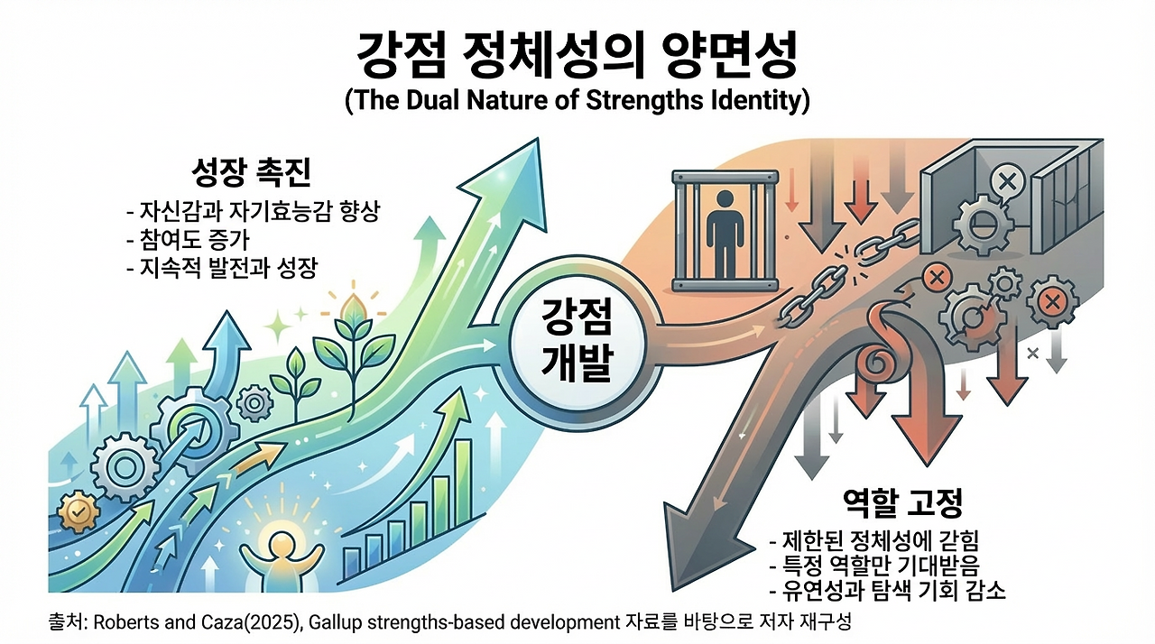 어떤 강점 정체성은 성장의 발판이 되지만, 어떤 강점 정체성은 사람을 하나의 역할에 묶어버리기도 합니다. 예를 들어 누군가가 늘 문제를 수습하는 데 강하다고 해서, 조직이 그 사람을 영원한 해결사로만 쓰기 시작하면 강점은 축복이 아니라 족쇄가 될 수 있습니다. 또는 누군가가 늘 배려와 조율에 능하다고 해서, 그 사람만 계속 감정노동과 관계정리에 투입된다면 강점은 인정이면서 동시에 제한이 됩니다. 긍정적 정체성 형성 연구가 정체성 수요(identity demands)와 정체성 위협(identity threat)을 함께 보아야 한다고 강조하는 이유도 여기에 있습니다. 긍정적 정체성은 힘이 되지만, 그 정체성이 특정 방식으로만 요구될 때 다시 부담이 될 수 있습니다.