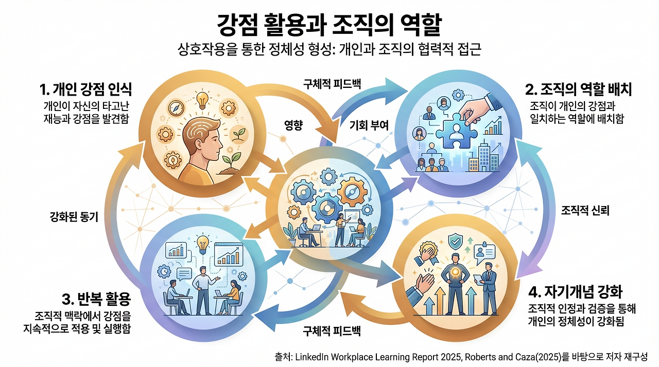 이 점은 최근 조직 연구와 실무 보고서 모두에서 확인됩니다. LinkedIn의 Workplace Learning Report 2025는 학습이 단순한 교육 이수로 끝날 때보다 경력개발(career development)과 연결될 때 훨씬 강한 효과를 낸다고 설명합니다. 보고서는 내부 이동, 리더십 개발, 경력 성장 지원을 적극적으로 운영하는 조직을 “경력개발촉진자(career development champions)”로 부르며, 이런 조직들이 더 나은 사업 성과를 보고한다고 정리합니다. 이 말은 곧 강점이 개인 안에서만 자라는 것이 아니라, 조직이 어떤 기회와 기대를 배치하느냐에 따라 더 선명해진다는 뜻이기도 합니다.