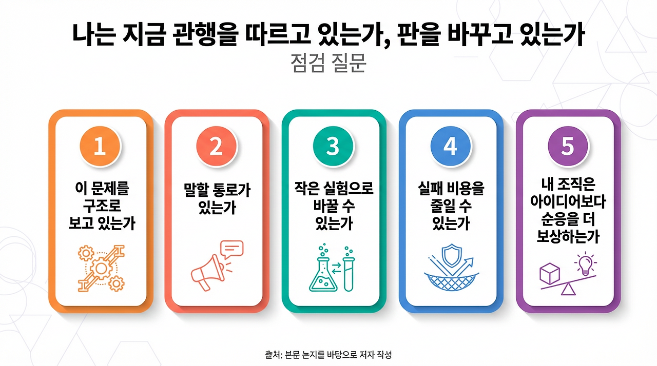 차이는 대개 여기서 갈립니다. 판을 바꾸는 사람은 지금 있는 절차를 자연현상처럼 보지 않습니다. 그는 “원래 다 이렇게 한다”는 말을 설명으로 받아들이지 않고, 왜 그래야 하는지 다시 묻습니다.
