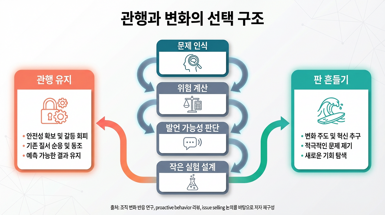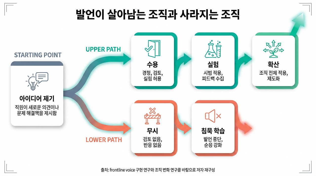 보건의료 현장을 다룬 2024년 연구는 frontline employee voice가 실제 개선으로 이어지려면, 현장의 발언이 조직 안에서 구현되는 경로가 있어야 한다고 설명합니다. 말은 많아도 실행되는 아이디어가 적다면, 직원은 결국 관행을 따르는 쪽이 더 낫다고 학습할 수 있습니다. 다시 말해 판을 바꾸는 선택은 “좋은 아이디어가 있느냐”보다, 그 아이디어를 말해도 되는가, 말한 뒤 실제로 움직일 수 있는가와 더 깊이 연결됩니다.