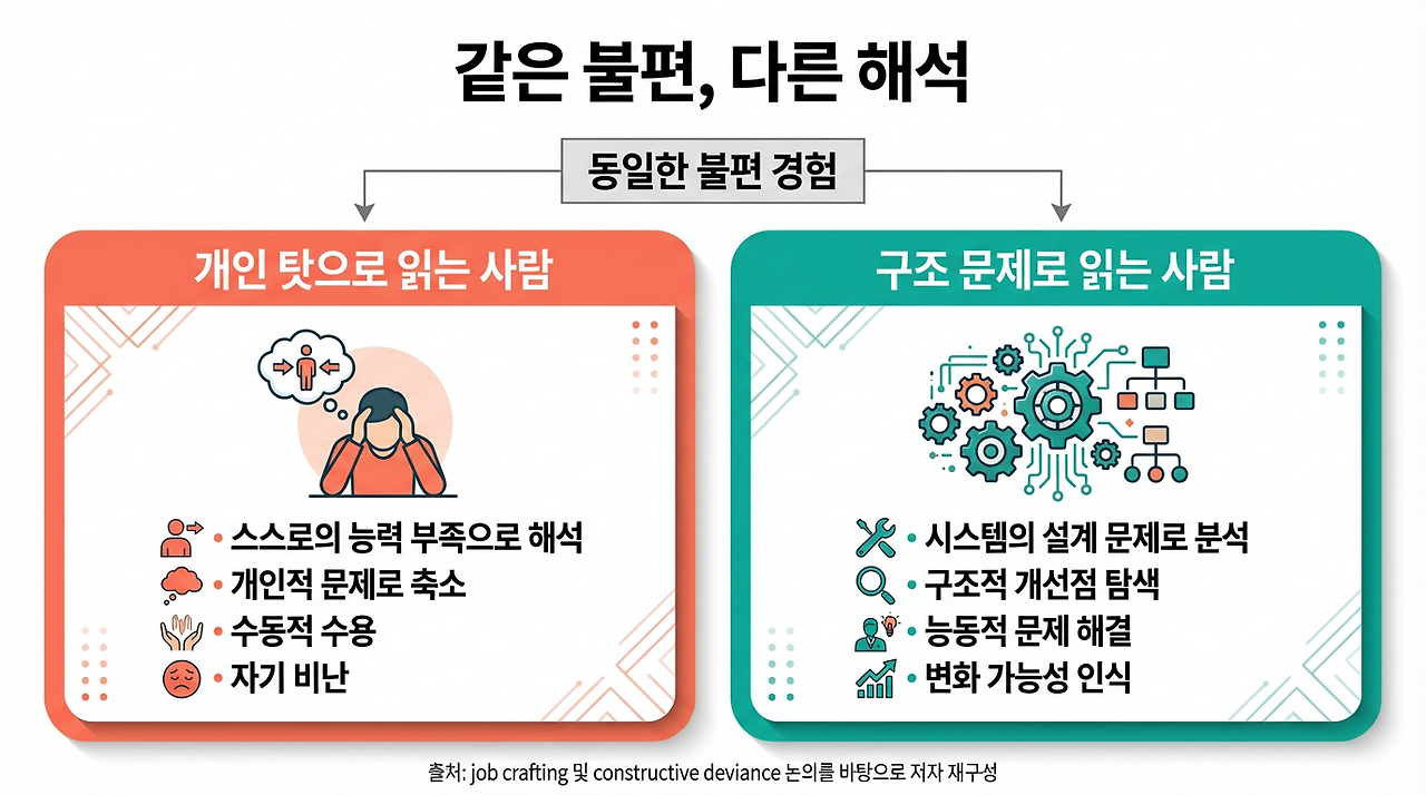 2025년 job crafting 종합 검토는 사람들이 자신의 과업과 관계, 일의 의미 해석을 능동적으로 바꾸려 할 수 있으며, 이 과정은 주어진 직무에 수동적으로 적응하는 것과 다르다고 설명합니다. 이 관점에서 보면 판을 바꾸는 사람은 단순히 반항적인 사람이 아니라, 현재의 일을 재설계 가능한 것으로 보는 사람입니다.