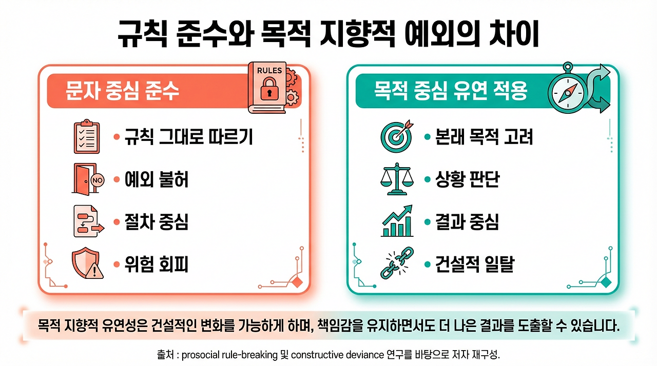 2025년 prosocial rule-breaking 연구는 최일선 전문직 종사자가 고객이나 시민을 돕기 위해 규칙을 유연하게 적용하거나 우회하는 행동이 나타날 수 있다고 설명합니다. 핵심은 이런 행동이 단순한 무질서가 아니라, 더 나은 결과를 위한 규칙 위반일 수 있다는 점입니다.