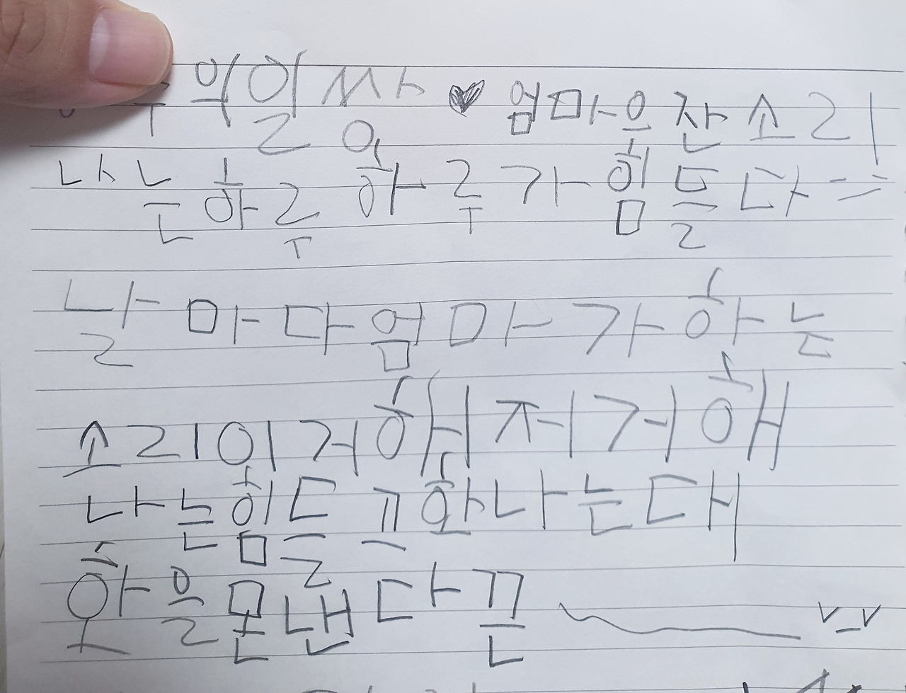 노트와 연필을 들고 방에 들어간 7살 아이는 자신이 하고 싶은 말을 글로 적어 나온다.