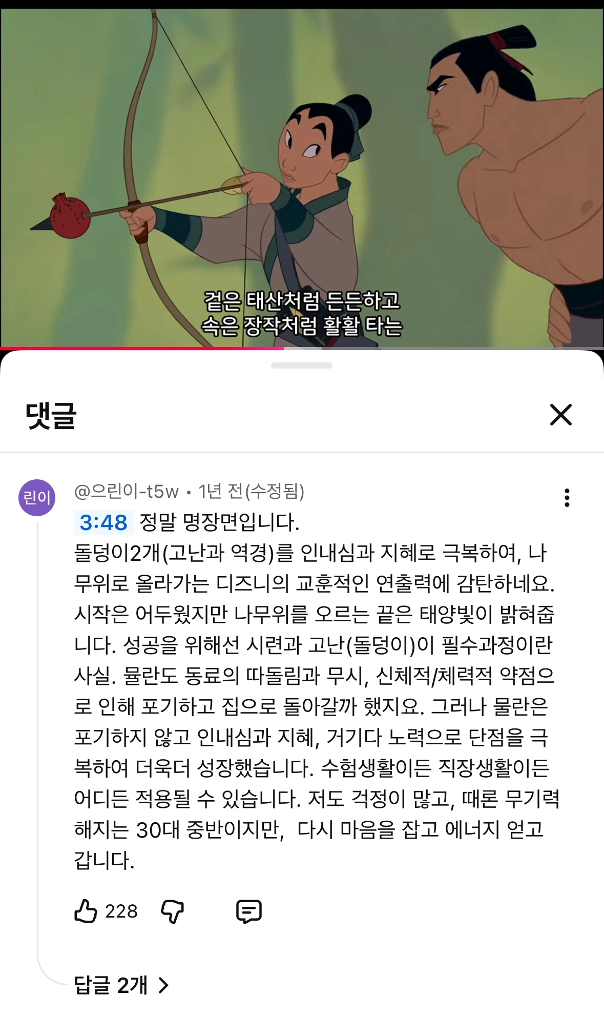 이 노래를 좋아한다. 뮬란하면 다들 “Refletion”을 많이 부르는데, 난 숨겨진 명곡이 이거라고 본다. 용기와 힘이 생겨 모든 일들을 이겨낼 수 있을 듯한 기분이 들기 때문에.