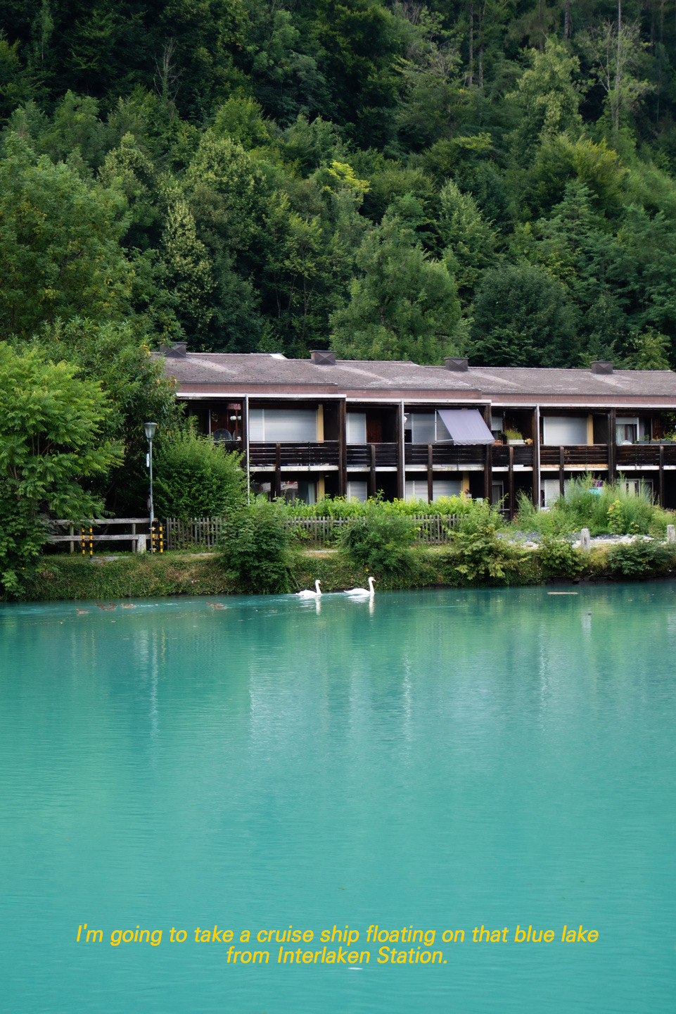 나는 인터라켄역에서 보이는 저 파란 호수 위에 떠있는 유람선을 탈 거야.