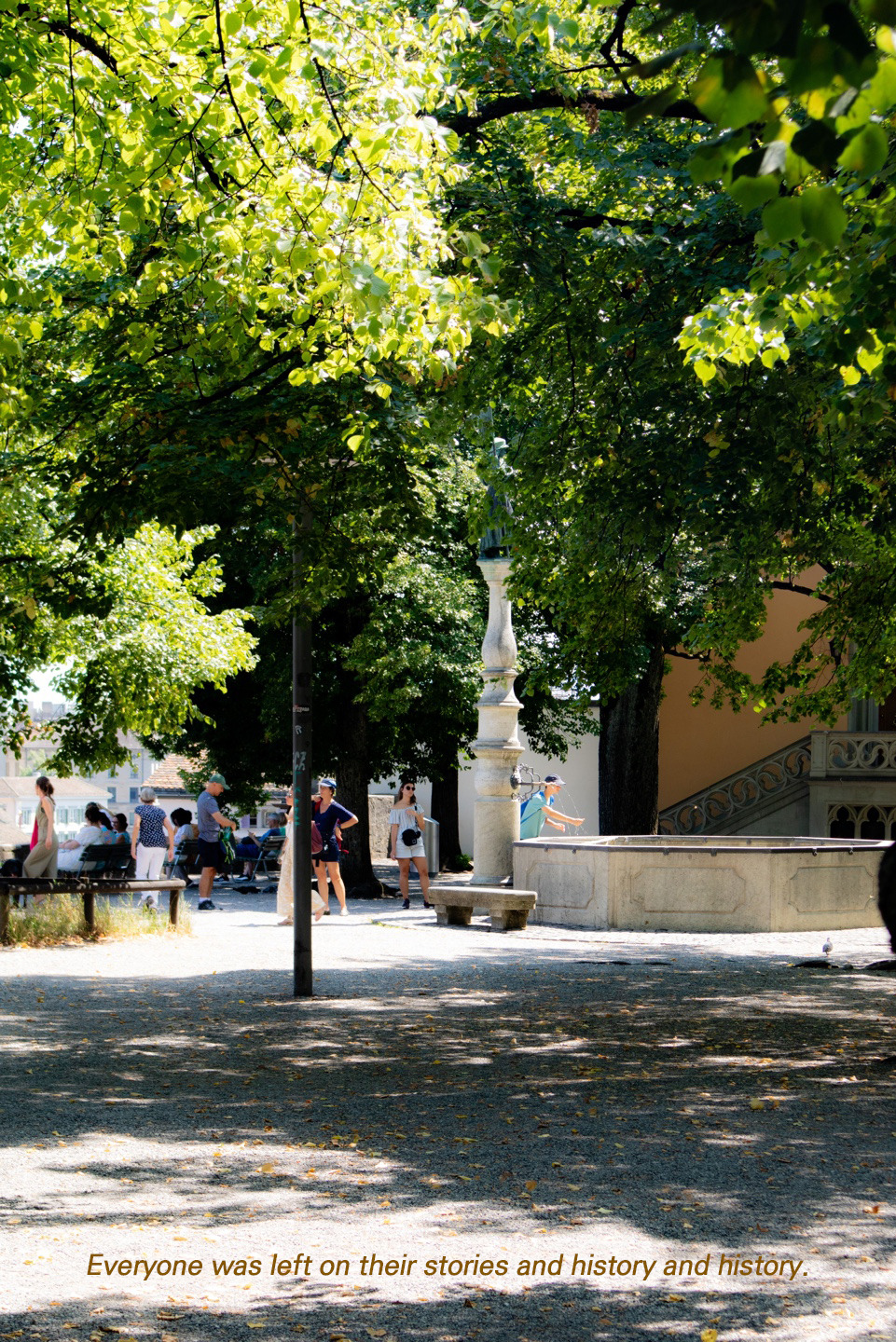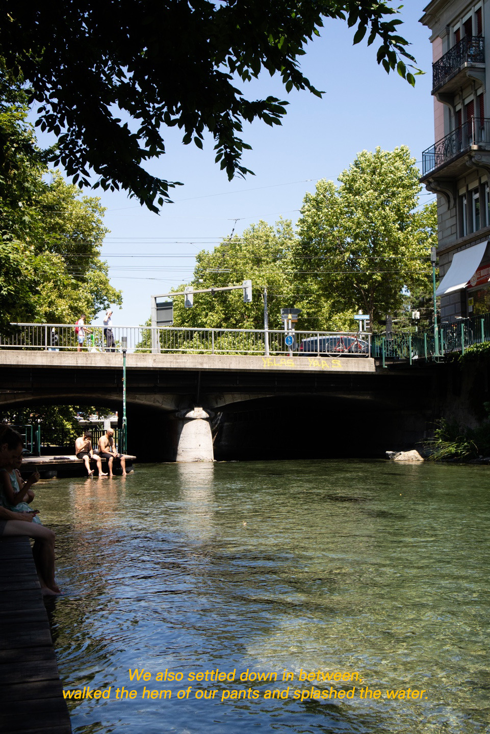 우리도 그 사이에 자리를 잡아 바지 밑단을 걷고 물을 첨벙거렸다. 기분이 좋은지 쌍둥이의 말투가 바뀌었다. 아래에는 엄청 큰 물고기들과 오리들이 사람 사이를 지나간다. 그저 쉬려고 눈에 보인 이곳에 온 것치곤 여기 때문에 취리히에 온 사람처럼 카메라를 든 손이 멈출 줄을 모른다.