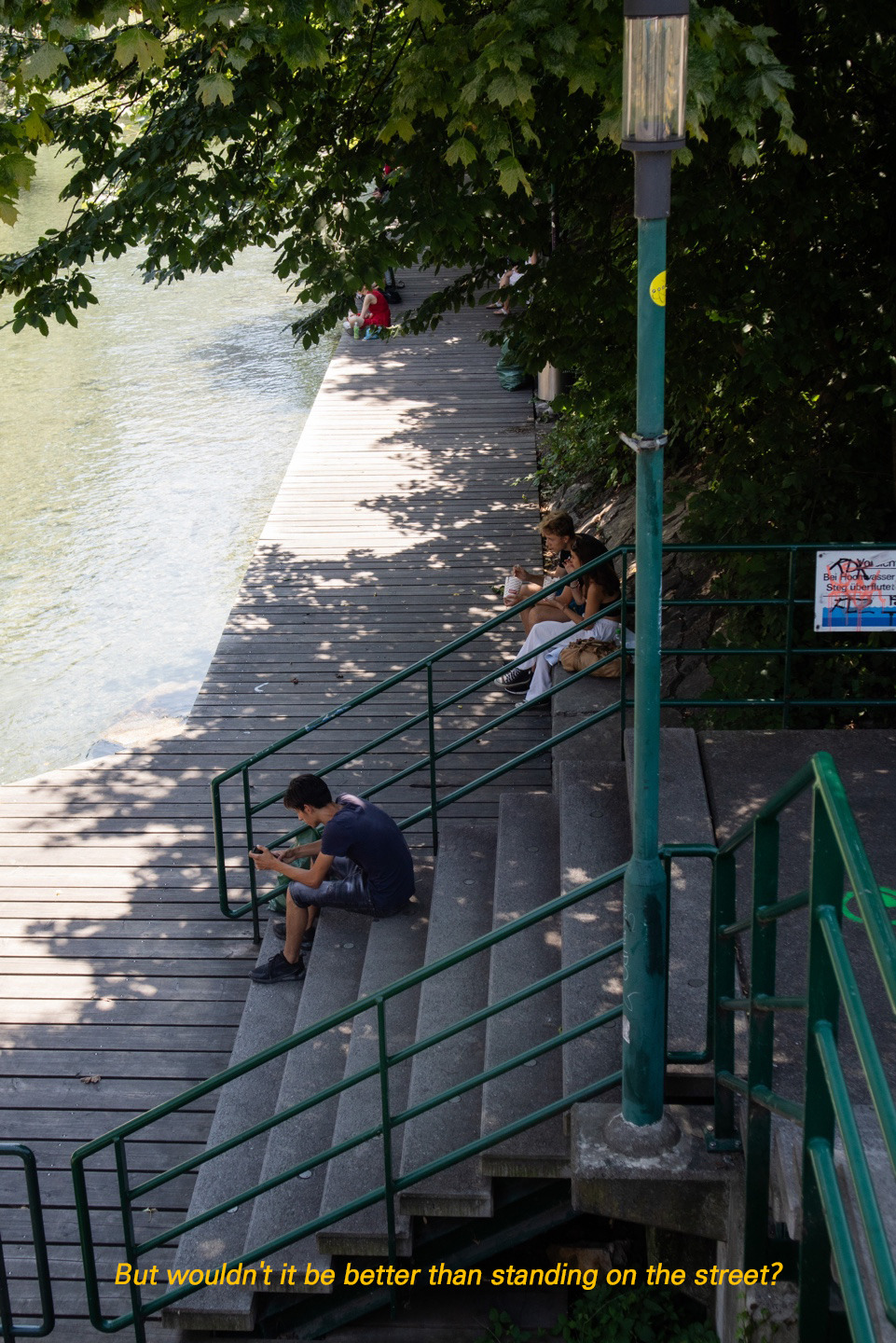 너무 더운 날씨 탓에 얇은 물방울들이 산책로 사이에 뿌려지고 있었다. 푸른 강 주변에는 여기저기 사람들이 편하게 앉아 이야기를 나누거나, 벤치에 누워 일광욕을 즐기는 사람들, 그리고 현실적으로 더위에 찌들어 고개를 푹 숙이고 있는 사람들까지. 현실과 이상을 넘나드는 멋진 유토피아였다.