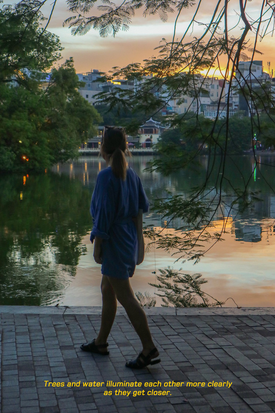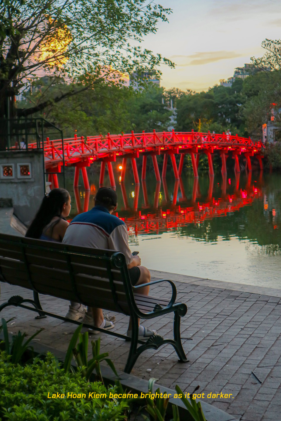 마사지샵에서 나와 5분 정도 걸으니 붉은 노을이 담겨있는 호안끼엠 호수를 만날 수 있었다. 우리의 주변이 점점 어두워질수록, 빨간 다리의 불빛은 더 강해졌다. 어느덧 노을과 다리의 아름다움의 정도가 서로의 접점에서 만나 조화를 이뤘고, 그제야 첫날의 감정들을 나열하며 정리하는 시간을 가지기 시작했다.
