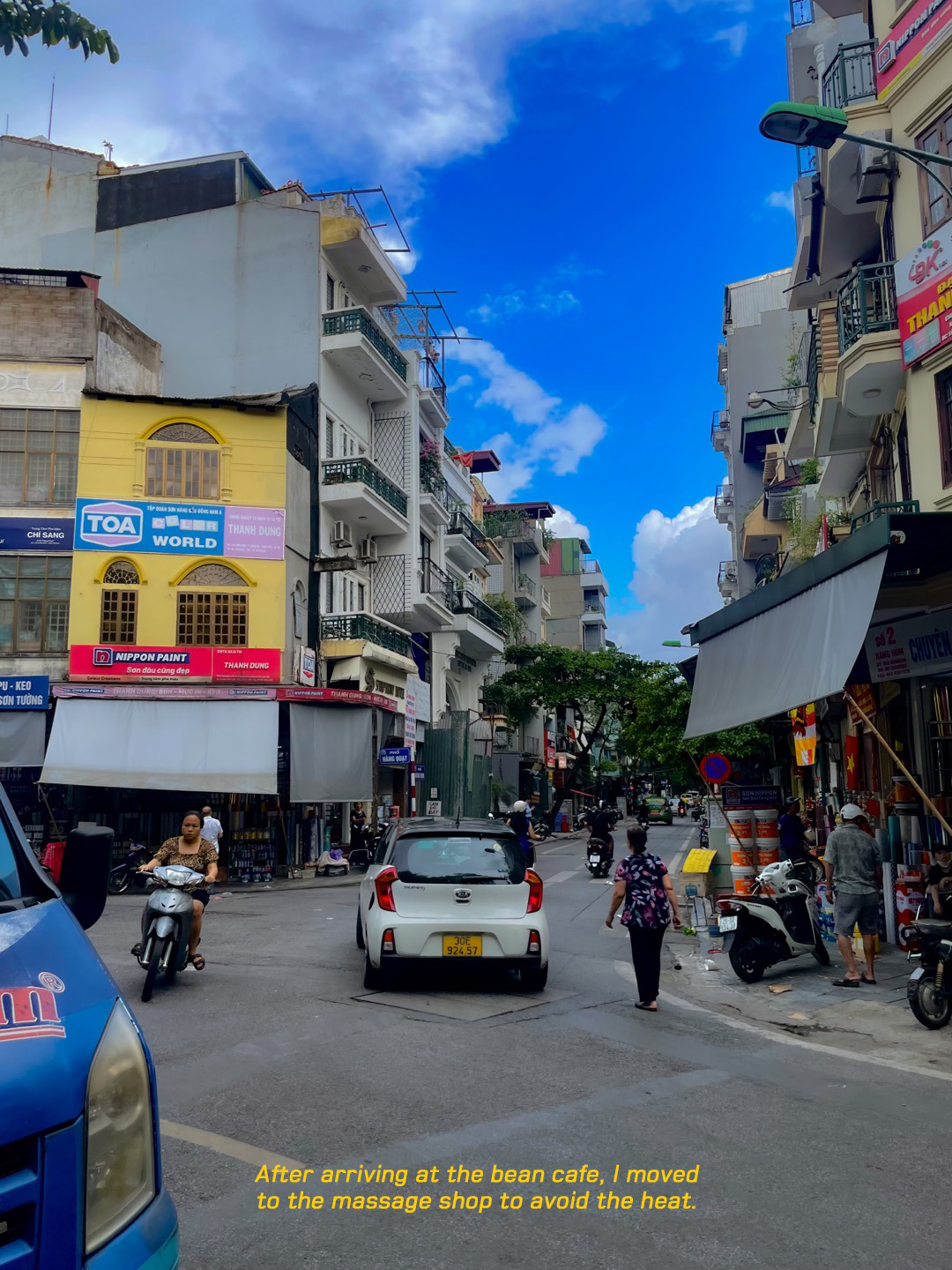 우리는 ‘꽌 안 응온’ 식당에 이어, 코코넛 커피가 유명한 ‘콩카페’에서 연이어 휴식을 취했다. 유심 없이 이 정도면 꽤나 잘 돌아다니는 것이 여행 어쩌면 내 적성에 맞는 것 아닐까? 하지만 적성에 맞는 여행가인 나도 에어컨이 없었던 콩카페에서는 별 수 없었다. 커피를 반쯤 허겁지겁 먹었을 때쯤, 주변에 있는 마사지샵을 서둘러 예약했다. 그리고 예약시간을 15분 후로 결정하곤 곧장 밖으로 나왔다.