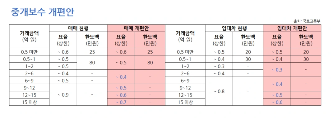 현행법은 임대차 계약 때 6억원을 기준으로 0.4%에서 0.8% 이하로 상한요율이 급증한다. 이 때문에 임대차 중개보수가 매매보다 높아지는 역전현상(6억원 이상 9억원 미만 구간)이 발생하는 고질적인 문제도 갖고 있다. 수요자들의 불만과 구조적인 문제로 중개보수 요율 개편에 대한 요구가 꾸준한 상황이었던 셈이다.