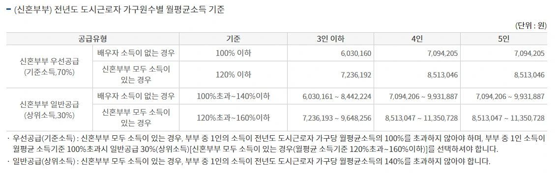 소득 기준도 존재한다. 공공이 짓는 국민 주택의 경우 전년도 도시 근로자 가구당 월 평균 소득의 100%(맞벌이 부부 120%) 이하인 가구에게 우선 공급(물량의 70%), 130%(맞벌이 부부 140%) 이하 가구에게 나머지를 공급한다. 민영 주택도 우선 공급(외벌이 100%, 맞벌이 120%) 기준은 동일하지만, 일반 공급 기준은 전년도 도시 근로자 가구당 월 평균 소득의 140%(맞벌이 부부 160%) 이하로 국민 주택 기준보단 낮다. 우선 공급 탈락자는 자동으로 일반 공급 대상자에 포함된다.