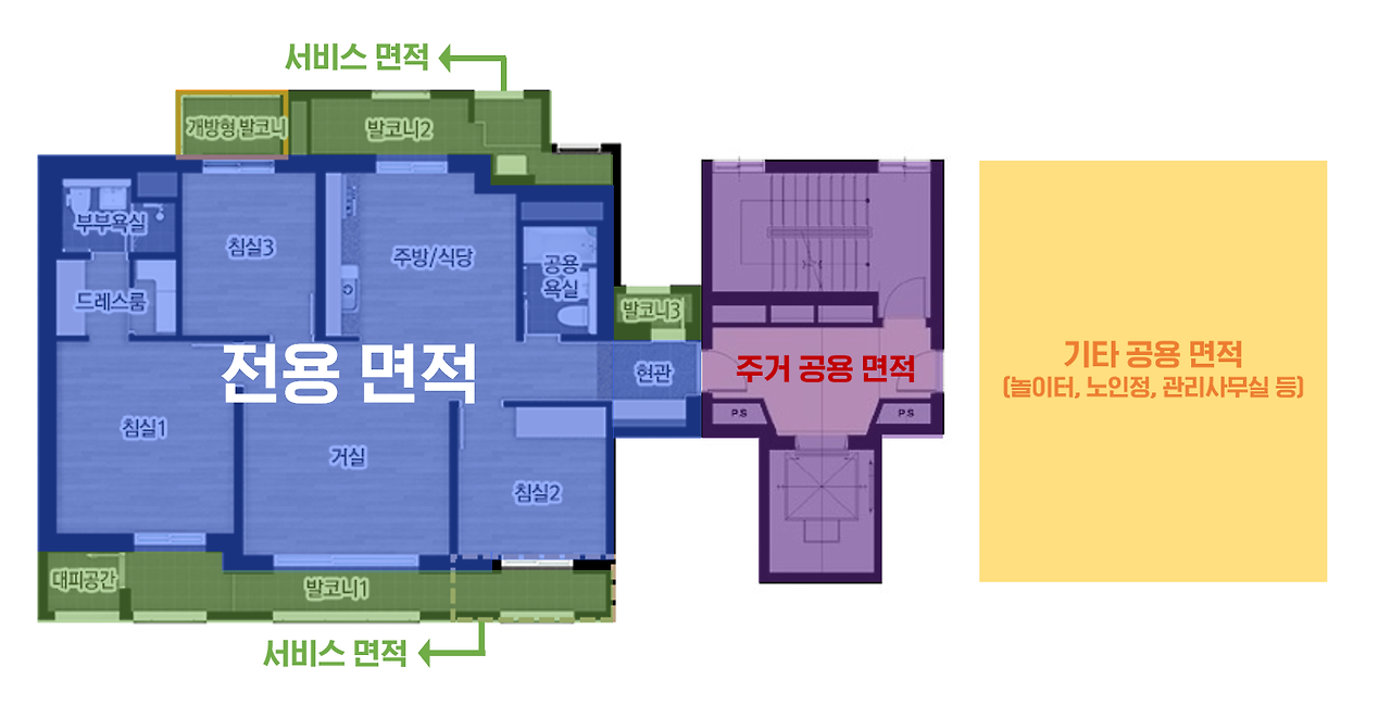 공용 면적은 두 가지로 나뉜다. 주거 공용 면적은 건물 내부에 해당하는 엘리베이터, 계단, 복도 등을 말하며, 기타 공용 면적은 단지 내부에 해당하는 놀이터, 관리실, 커뮤니티 시설 등을 말한다. 이밖에 서비스 면적은 베란다, 발코니, 테라스 등을 뜻하는 말이다.