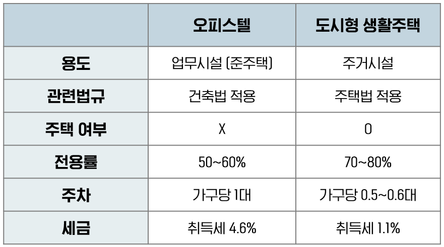 둘의 차이는 전용률과 주차 비율에서도 갈린다. 쉽게 말해 같은 면적을 사더라도 오피스텔은 공간은 좁지만 주차가 여유롭고, 도시형 생활주택은 공간은 넓지만 주차가 빠듯하다는 특징을 가진다. 이러한 점을 개선하기 위해 오피스텔과 도시형 생활주택을 혼합해서 건축하는 건물들이 늘어나고 있는데, 여기서 기적의 논리가 등장한다. 잘 살펴보면 오피스텔을 포함시켜 층을 높였지만 주차대수 기준은 도시형 생활주택에 맞춰서 사업성을 높인 건물이 은근히 많다. 그러니 오피스텔이나 도시형 생활주택을 계약할 일이 있다면 이 점을 유의 깊게 살펴보도록 하자. 그래야 손해 안 본다.