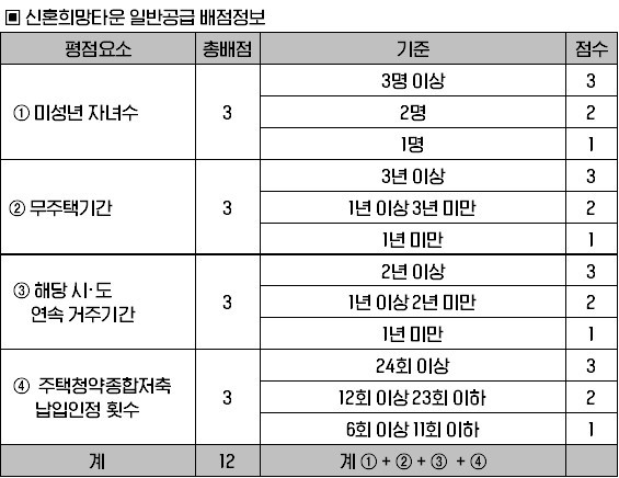 해당지역 거주기간은 △3년 이상 3점 △1~3년 미만 2점 △1년 미만 1점 △해당지역 거주자가 아닌 경우 0점이며, 혼인기간은 △3년 이하 3점, △3년 초과 5년 이하 2점 △5년 초과 7년 이하 1점 △예비신혼부부 0점이다. 저축납입횟수는 △24회 이상 3점 △12~24회 미만 2점 △6~12회 미만 1점이다.