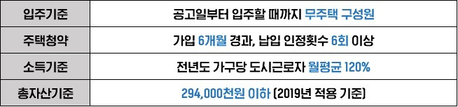 입주 기준으로는 공고일부터 입주 시까지 무주택 세대구성원이면 된다. 또한, 주택청약종합저축 및 청약저축 가입 6개월 이상, 저축 납입횟수 6회 이상 되어야 한다. 소득기준은 전년도 가구당 도시근로자 월평균 소득 120%로 3인 기준 월 648만원, 맞벌이 가정인 경우 3인 기준 월 702만원 수준 이하면 청약할 수 있다. 총자산기준은 2억9,400만원 이하이면 된다.