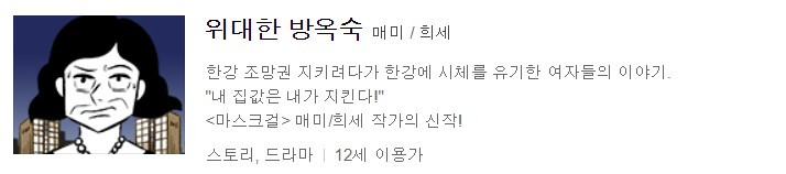 요즘 즐겨보는 웹툰 중에 ‘위대한 방옥숙’이라는 작품이 있다. 없는 살림에 한강 조망 아파트를 매입한 주인공 방옥숙이 주변 재개발 사업으로 조망권을 침해 받을 위기에 놓이자 이를 반대하기 위해 아파트 부녀회와 힘을 모으다 큰 사건에 휘말리게 되는 내용이다. (블랙코미디물이라 씁쓸하지만 재밌고 흥미진진하다.)