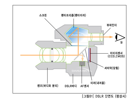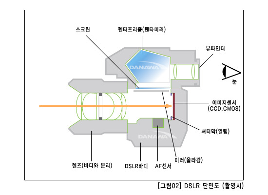 DSLR이 아닌 다른 카메라들은 미러와 펜타프리즘 의 과정을 거치지 않습니다. 렌즈를 통해 들어온 빛은 셔터막에서 막혀 더이상 진행할 수 없게 되겠죠.