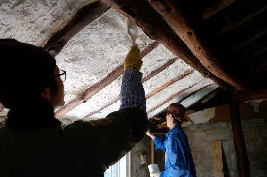 이 작업은 철저한 분업으로 진행되었다. 가장 먼저 밑 작업으로, 흙이 발려진 천정에 붓으로 물을 바르는 작업이 필요하다. 백시멘트 반죽이 흙에 잘 달라붙게 만들기 위함이다. 그 작업은 도련님이 해주었다. (파란 작업복의 나의 도련님) 그리고는 이어서 1차 작업은 도련님이 백시멘트 반죽을 손으로 덕지덕지 발라 놓는다.
