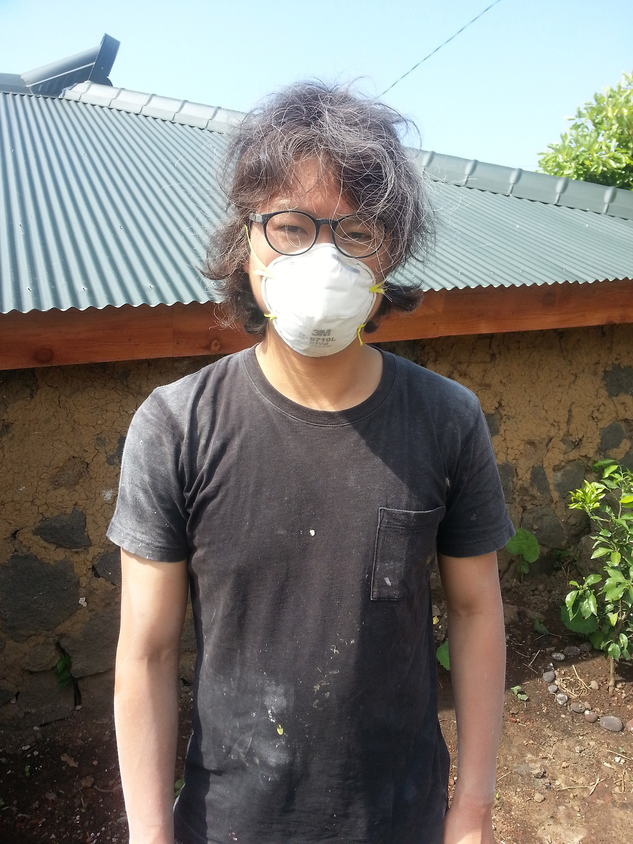 작은 방의 흙벽 부분과 세면실 천정,화장실 벽 등 핸디코트 작업이 필요한 부분에 열심히 핸디코트를 펴서 발라주었다. 바깥채 작업 할 때는 핸디코트가 내 맘대로 잘 발리지 않아서 울면서 뛰쳐나갔던 일이 있는데, 이제는 조금 익숙해졌는지, 기술이 생겼는지 조금 더 쉽게 할 수 있었다. 그래도 핸디코트가 굳으면 매끈하게 마감이 되지 않고, 울퉁불퉁하고 삐죽한 부분이 있기 때문에 샌딩을 해주어야 한다. 그래서 J가 하르방이 되어서 나타났다. 방진마스크를 쓰고, 사포를 들고 열심히 사포질을 해서 매끈한 벽을 만들었고,