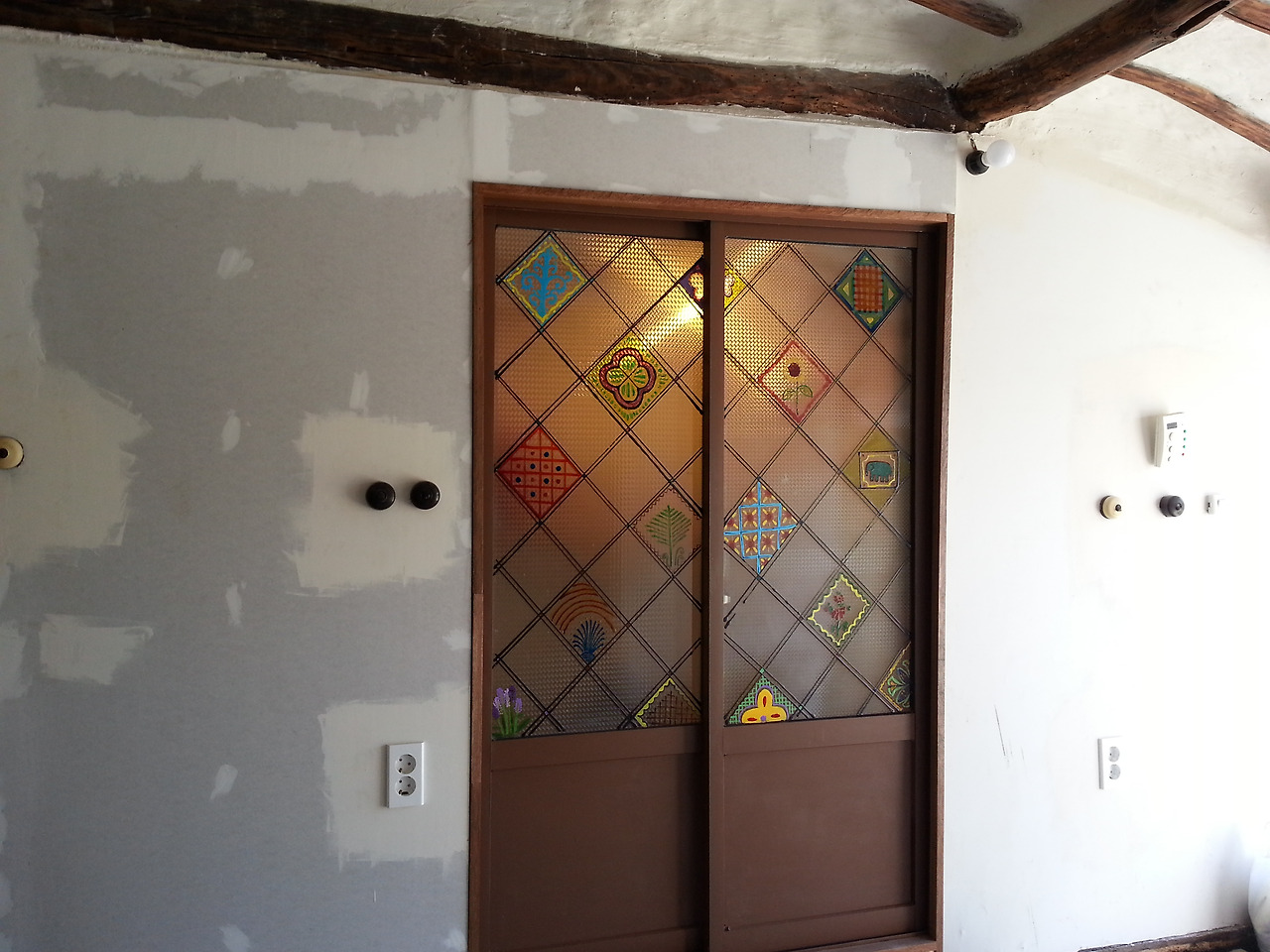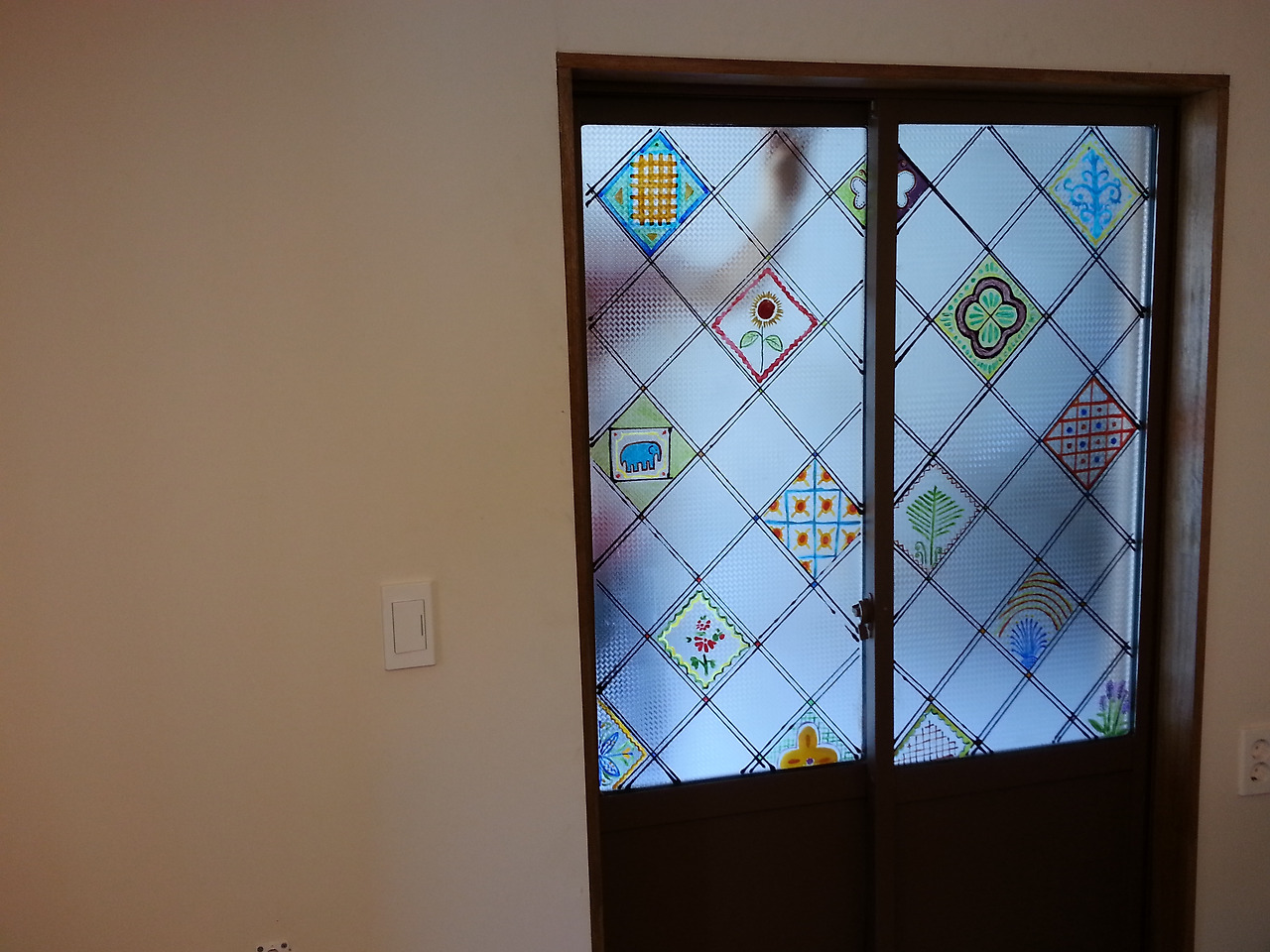 1인실 알루미늄 미닫이문이다. 원래 알루미늄으로 되어있는 미닫이 문인데, 버리고 새로 만들자니 아깝고, 그냥 두자니 어울리지 않아 어떻게 하면 좋을까.. 한참을 고민하다가 일단 색을 칠해보기로 했다. 먼저, 젯소를 발라준 후에 나무에 가까운 색의 페인트로 열심히 칠해주었다. 멀리서 얼핏 보면 나무문 같기도 하다... 거기에 뭔가 포인트를 주기 위해 스테인드글라스 물감으로 그림을 그려보았다. J가 열심히 격자를 그렸다. J와 사이좋게 한 칸씩 나눠서 그림을 그렸다. 낮에는 현장 작업, 밤에는 이러한 야간작업이 이어졌다. 하나씩 알록달록 그리다 보니 꽤나 마음에 들었다.
