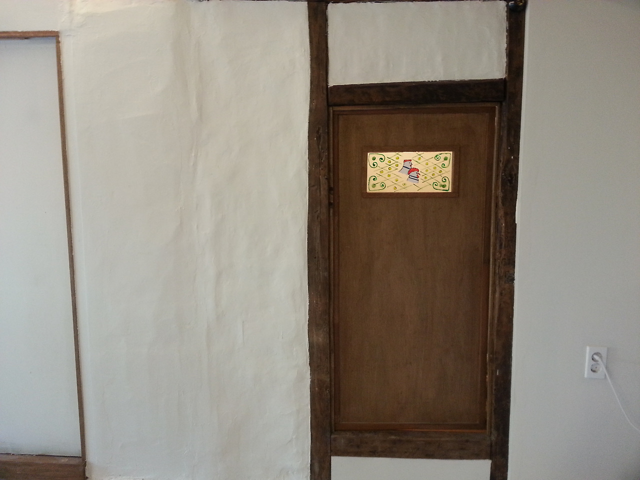 골방 문틀에 달아보니 이런 모양이다. 아래턱이 꽤 높이 올라와있고, 위에 높이도 낮아 드나들 때 꽤 불편하겠지만 그래도 흥미로운 구조이다. 닭을 그려 넣었더니, 정말 닭장 같기도 하다.