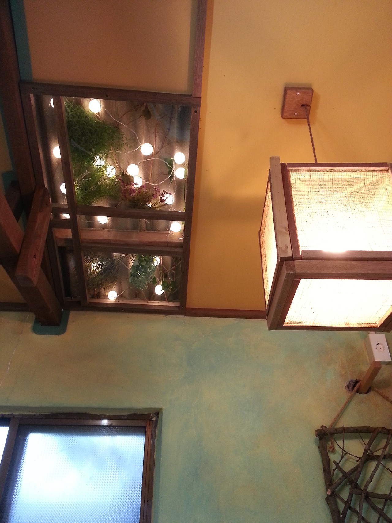 처음에는 투명 아크릴 너머로 보이는 초록의 넝쿨이 너무도 예쁘고 생명에너지가 전해지는 것 같아 좋았는데.. 공사를 진행하며 시간이 흐를수록 초록의 잎들은 점점 시들어갔고, 하나 둘 떨어지기 시작했다. 그걸 지켜보며 마음이 좋지 않았다.. 그러나 모든 시련은 전화위복이 될 수 있다 했던가! 넝쿨이 다 떨어져 텅 비어버린 저 천정을 어쩌면 좋을까.. 고민하다 이렇게 해보기로 했다. 육지에서 공수해온 조화들을 넣고, 탁구공 조명을 만들어 넣었다. 그랬더니 마음에 쏙 드는 천정조명이 만들어졌다. 처음의 초록 잎들을 볼 수 없어서 아쉽긴 하지만, 넝쿨의 줄기와 몇몇 살아남은 건강한 잎들도 사이사이에 보인다.