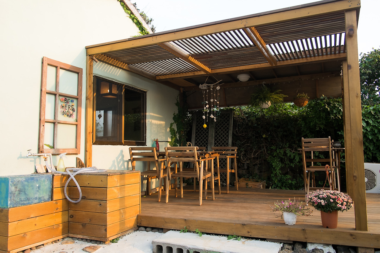 천정 빗살 작업을 마치고, (빗살 작업은 손이 정말 많이 가는 작업이었다. 나무를 같은 길이로 하나하나 재단하여 같은 간격으로 조립을 해야 하는 것이었다. 스테인과 바니쉬 처리를 하는 데에도 구석구석 신경 써서 칠해야 해서 힘이 들었다.) 마감 처리를 한 후에 데크 천정에 올렸다. 마지막으로 전체적으로 스테인과 바니쉬 작업을 하면 끝이다. 나는 데크가 햇볕이 잘 들고, 답답하지 않은 공간이 되었으면 싶었다. 그래서 그늘을 많이 만들려는 J에 반대하여 빗살로 천정을 만들기를 고집을 부렸다. 내가 고집부린 대로 1/3은 그늘, 2/3은 빗살이 되었다.