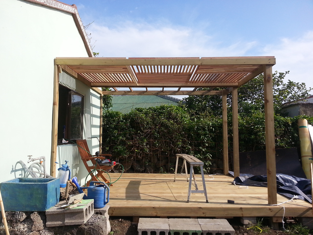 카페 창고 옆 꽤 널찍한 텃밭 자리를 빌어서 야외 데크를 만들기로 했다. 잔디 깔기에 이어서 내가 잔뜩- 기대해온 작업이다. 데크를 만들려면 골조와 상을 잡는 것이 우선되어야 한다. 천정 파고라 작업을 하는데, 크기가 크기인 만큼 꽤나 무기가 많이 나갔다. '이걸 우리 둘이 어떻게 들어 올리지? ' 걱정했는데, J는 예상외로 (?) 꽤 똑똑한 것 같다. 위의 사진처럼 벽 쪽 기둥을 먼저 세워 벽에 고정시키고, 파고라 골조의 한쪽 끝을 벽 쪽 기둥에 걸친 후, 다른 한쪽에서 들어 올려 기다란 나무를 대어 고정시켜주면 된다. '똑똑해..' 수직을 맞춰 기둥을 세워주고 흙을 많이 파고, 기둥 아래에는 벽돌 같은 것으로 받쳐준다. 나무에 흙이 닿지 않게 하기 위함이다. 그리고 시멘으로 채워서 굳히면 된다.