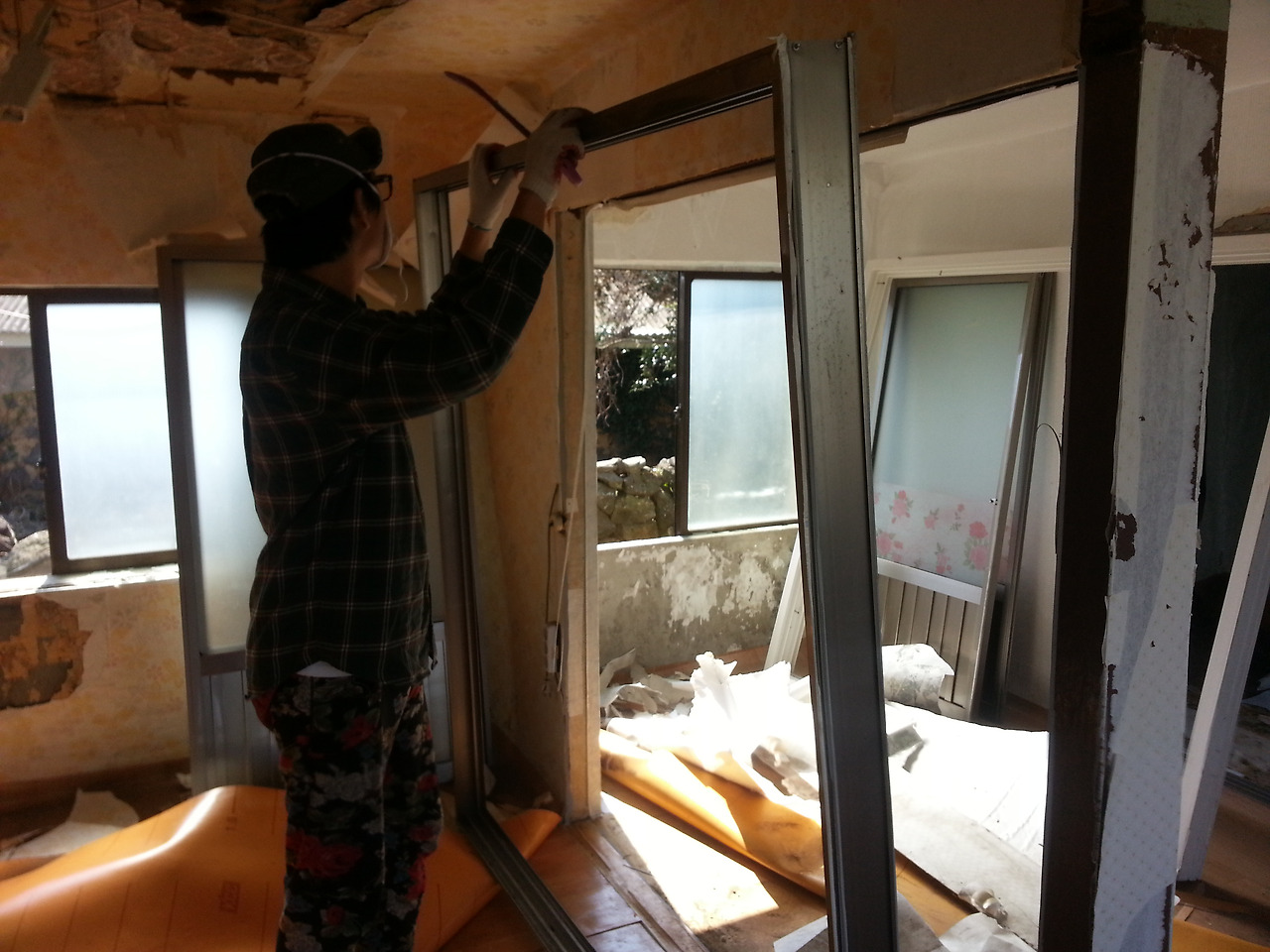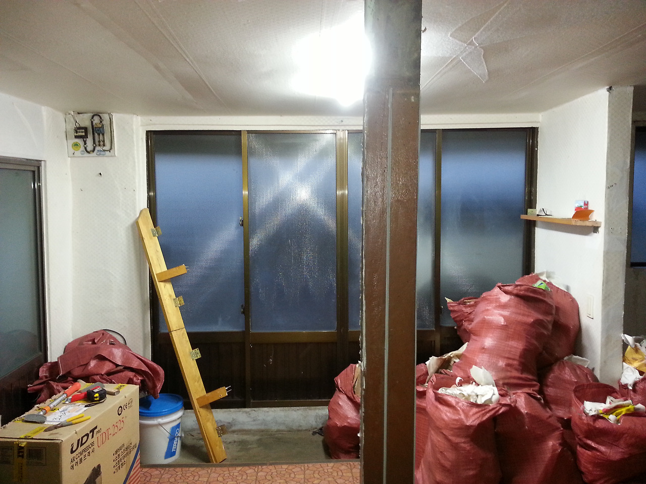 이 집은 집안 모든 방들과 거실이 미닫이 문으로 연결되어있는 구조로 되어있었다. 신기하게도 이 자그마한 집구석에 커다란 미닫이 문만 5개나 있었다. 그래서 우리는 이 미닫이 문들부터 모조리 떼어버리기로 했다. J가 칼로 실리콘을 잘라내고, 망치로 탕탕 두들기고, 빠루로 밀어 뽑아내니 수욱- 하고 쉽게 빠져나왔다. ( 내 기억에는 그렇다..;;)
