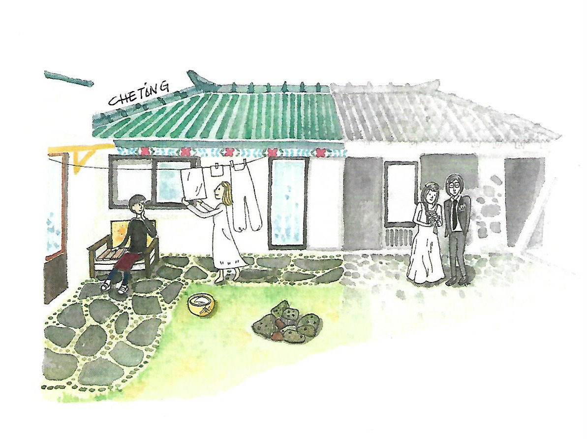 그림의 오른편은, 공사 시작 전에 집 앞에서 남겨두었던 흑백 웨딩사진을 그렸고,