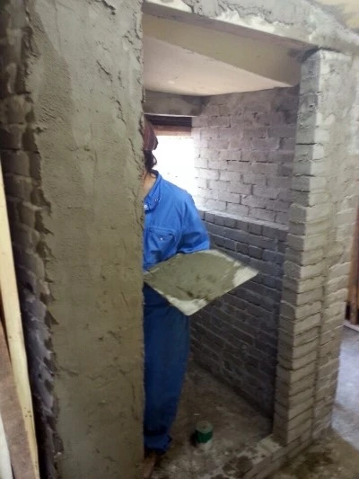 며칠 후, 쌓아 올린 벽돌은 탄탄하게 굳었고, 몸에 힘을 잔뜩 주어 기대어도 무너지지 않았다. 성공적이다! 사실, J도 나도 이렇게 벽 전체를 조적 하는 건 처음이라 (작은 면적의 조적은 바깥채 공사할 때 했었다.) 과연 잘 할 수 있을까 걱정했는데, 다행히도 결과는 성공적이었다. 탄탄하게 굳었으니 마감 미장을 할 차례이다. J는 미장 작업을 여러 번 반복하더니 이제 어느 정도 기술도 생긴 모양이었다. 흙손을 이용해 반듯하게 마감을 하는 모습이 흡사 미장공이었다.