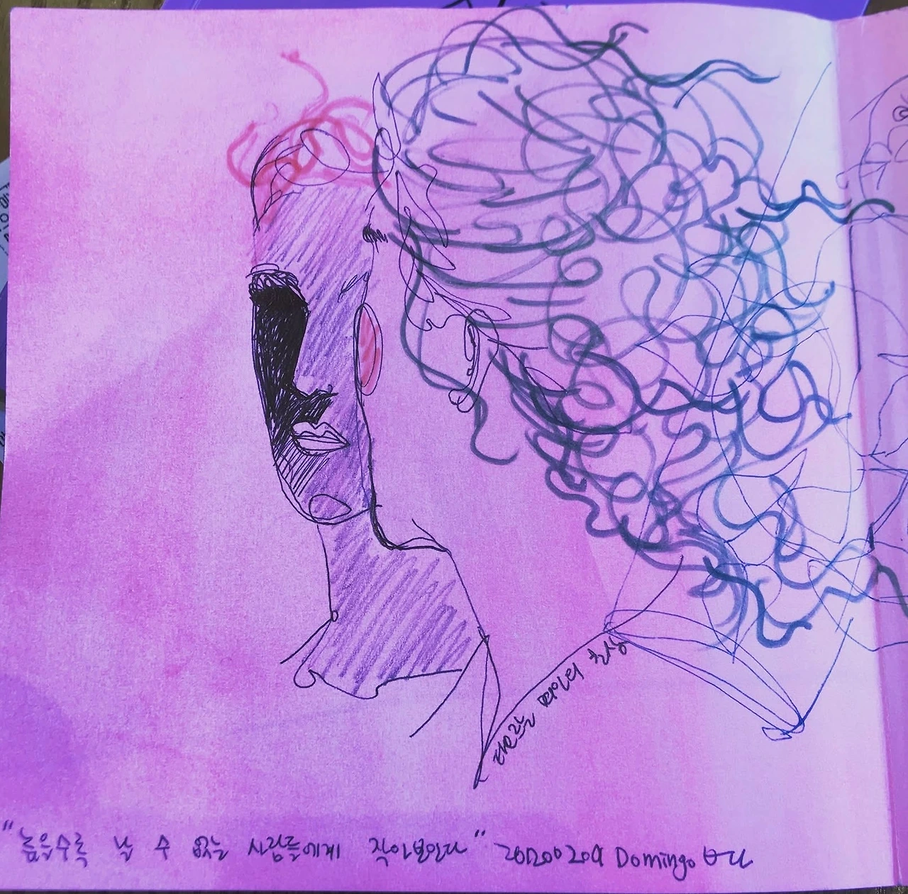 타오르는 여인의 초상. 종이에 펜. 숲