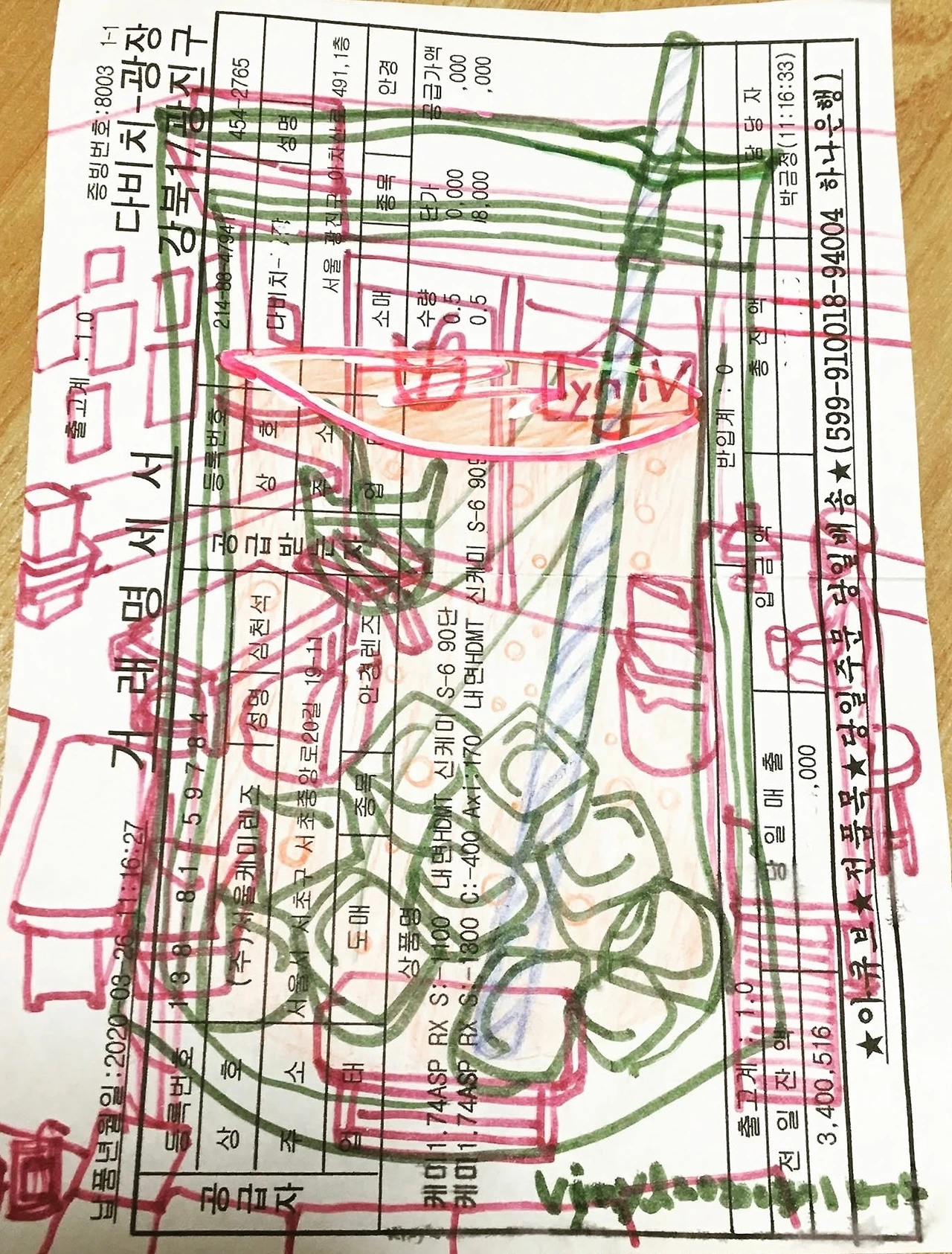 Vynil 안의 vynil. 영수증위에 펜 드로잉. 숲