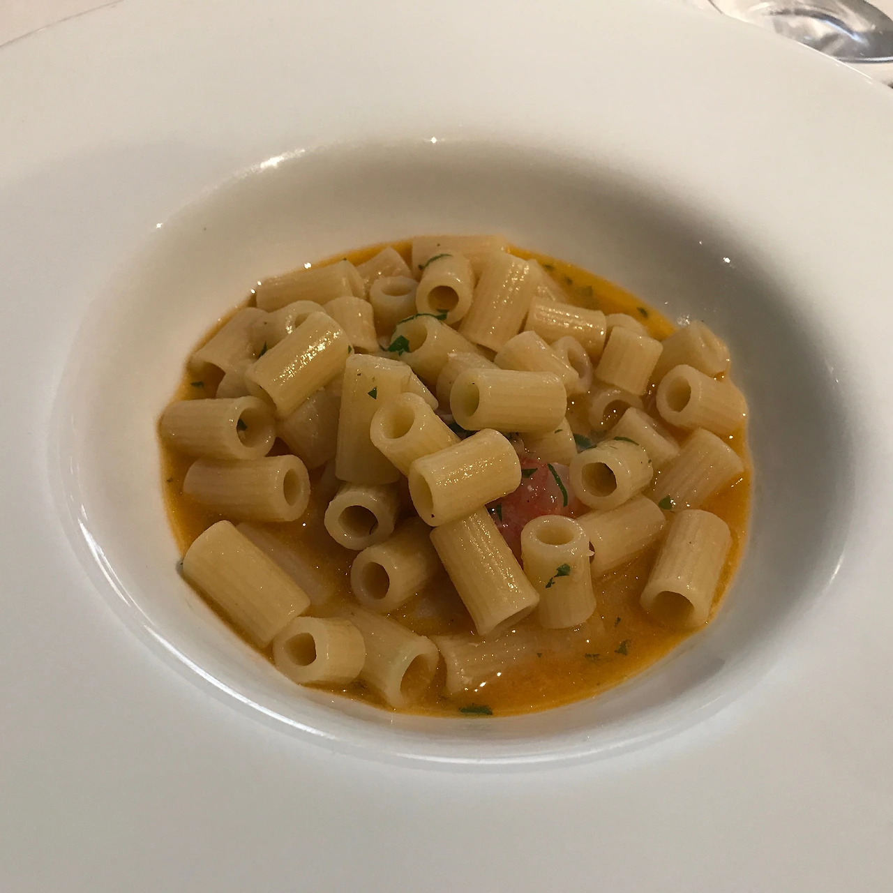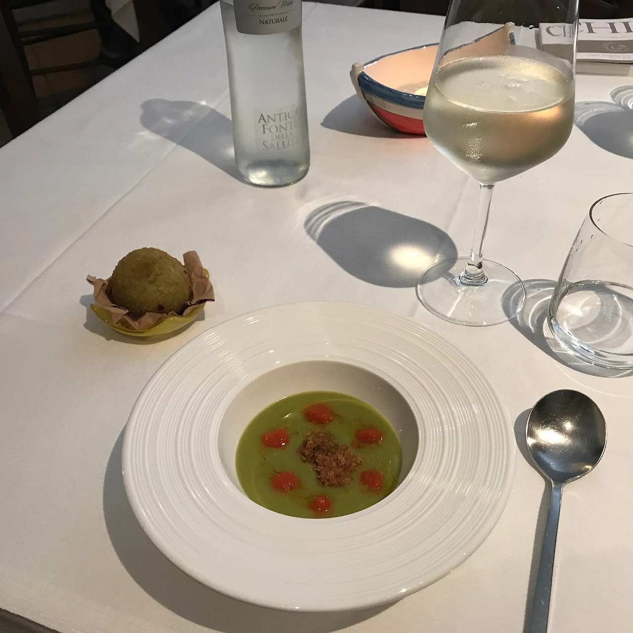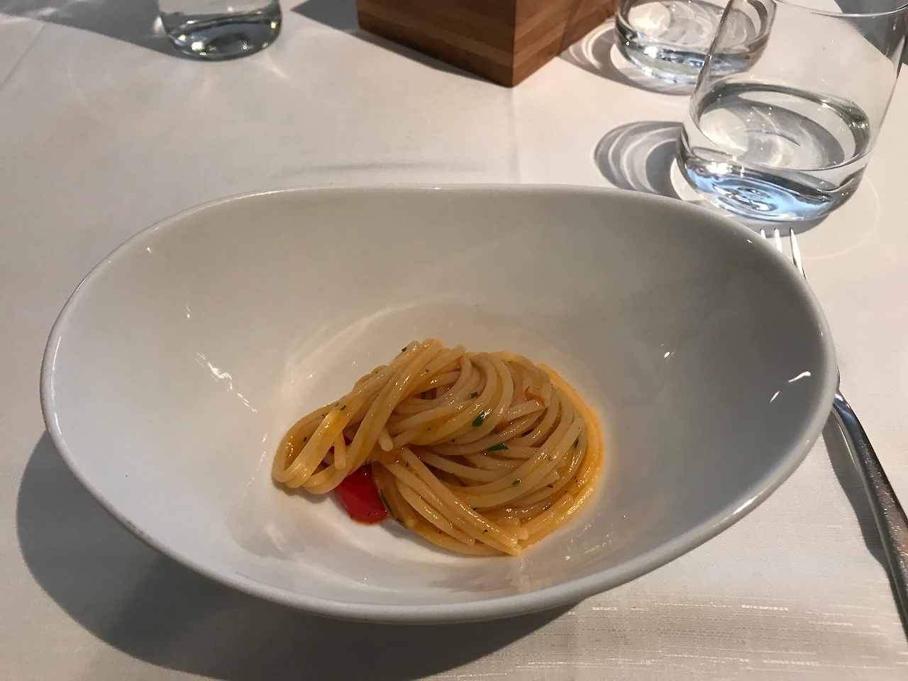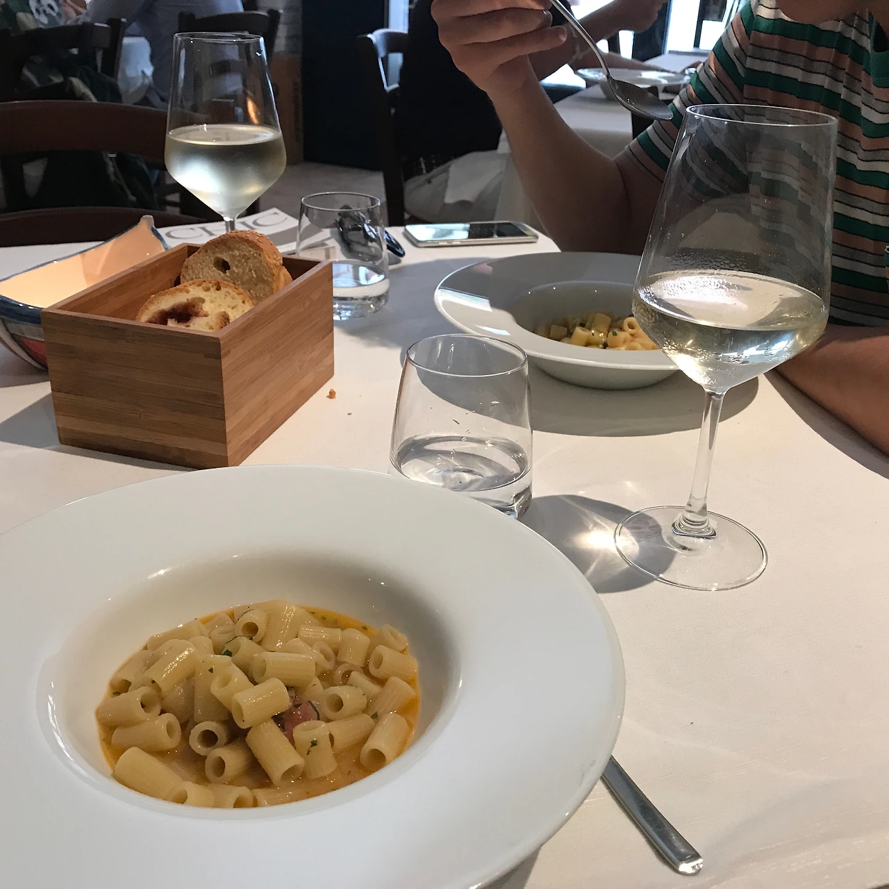 점심엔 48유로와 65유로 코스가 있다. 테이블 차지가 인당 2유로, 물은 3유로다. 스파클링 와인 한 잔에 5유로, 커피 한 잔에 2유로를 추가하면 된다. 우리는 점심엔 가볍게 먹자는 생각으로 48유로짜리 코스를 시켰다. 나중에 여기에 서비스로 파스타와 디저트를 하나씩 추가로 줘서 배가 터질 뻔했다! 그렇더라도 너무 맛있어서 남기는 한이 있더라도 65유로 코스를 시켜도 좋았겠다는 생각마저 들었다.