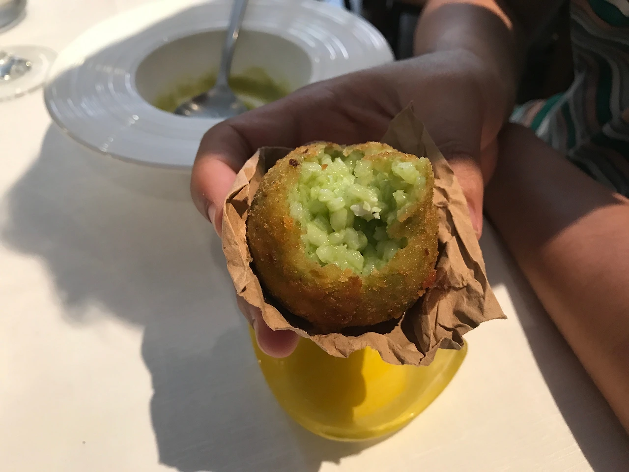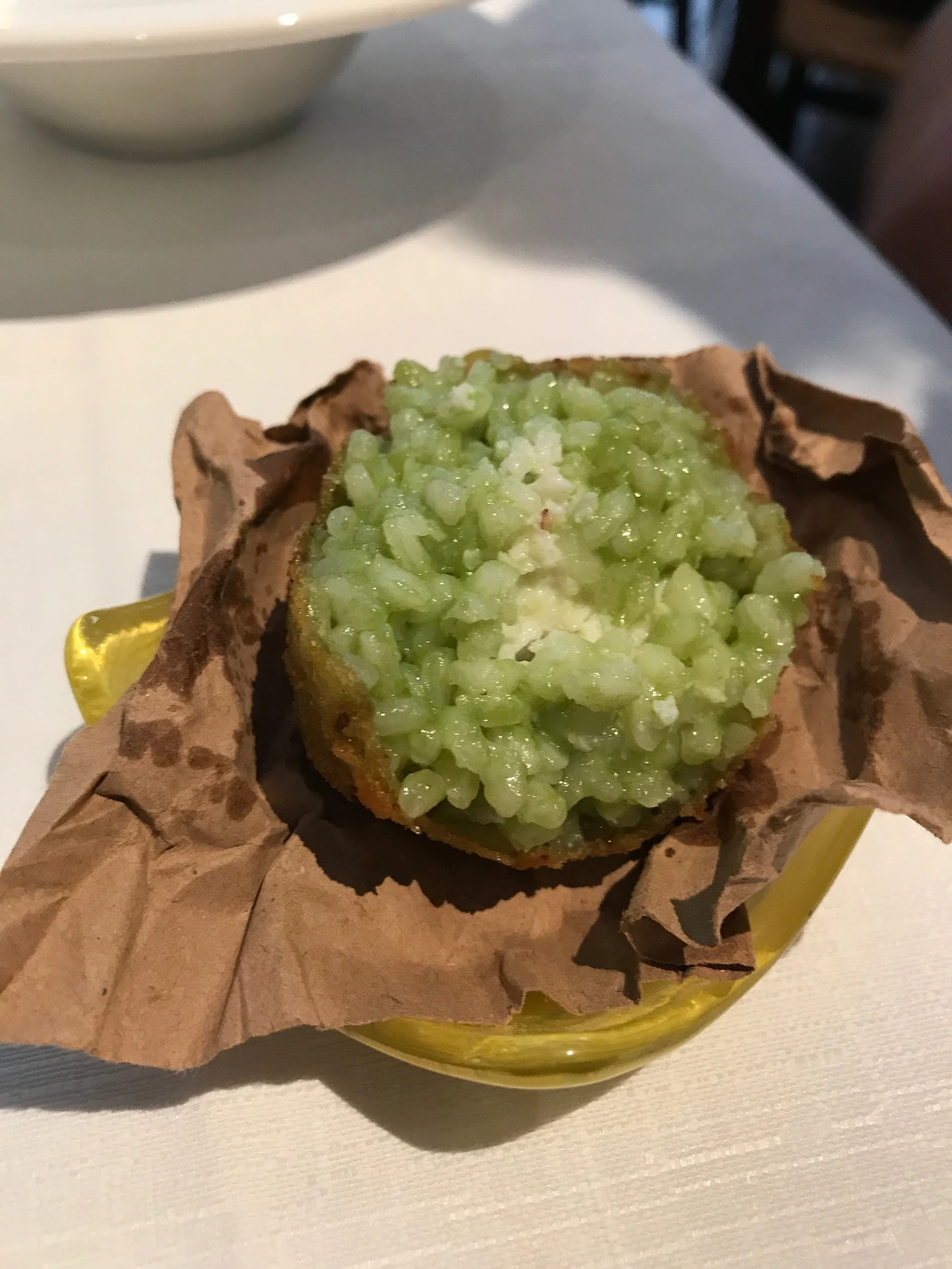 이 아란치니는 생긴 것으로 평가하면 안 된다. 고로케 같이 생겼다고 고로케 맛이 아니다. 얇고 바삭한, 섬세하게 구워진 튀김옷 안에는 부드러운 시금치 리조또가 가득 차 있다.