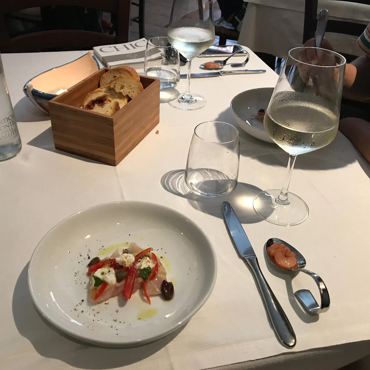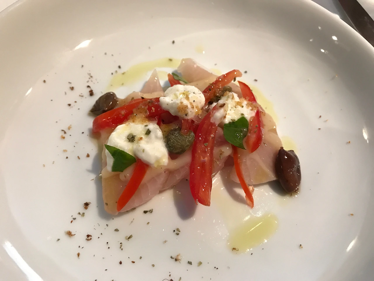 시칠리아에서는 한국에서처럼 날것의 생선을 자주 먹는 듯하다. 그런데 한국에서처럼 활어를 먹는다기 보다는 살짝 올리브 오일 등에 절이고 숙성한 생선을 먹는 것 같다. 일본의 사시미와 더 비슷하다. 여기서 준 생선은 파프리카, 케이버, 치즈, 올리브 등을 곁들였는데 하나도 비리지 않고 입에서 녹아내릴 듯이 부드러웠다.