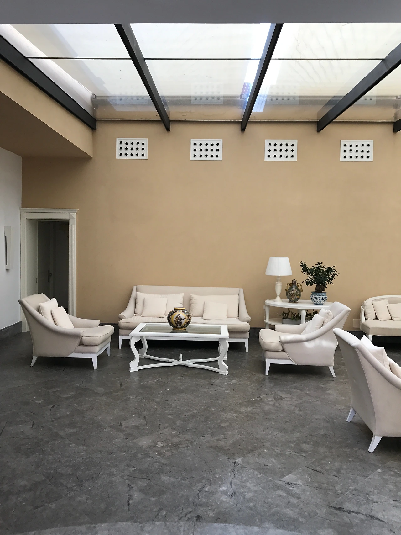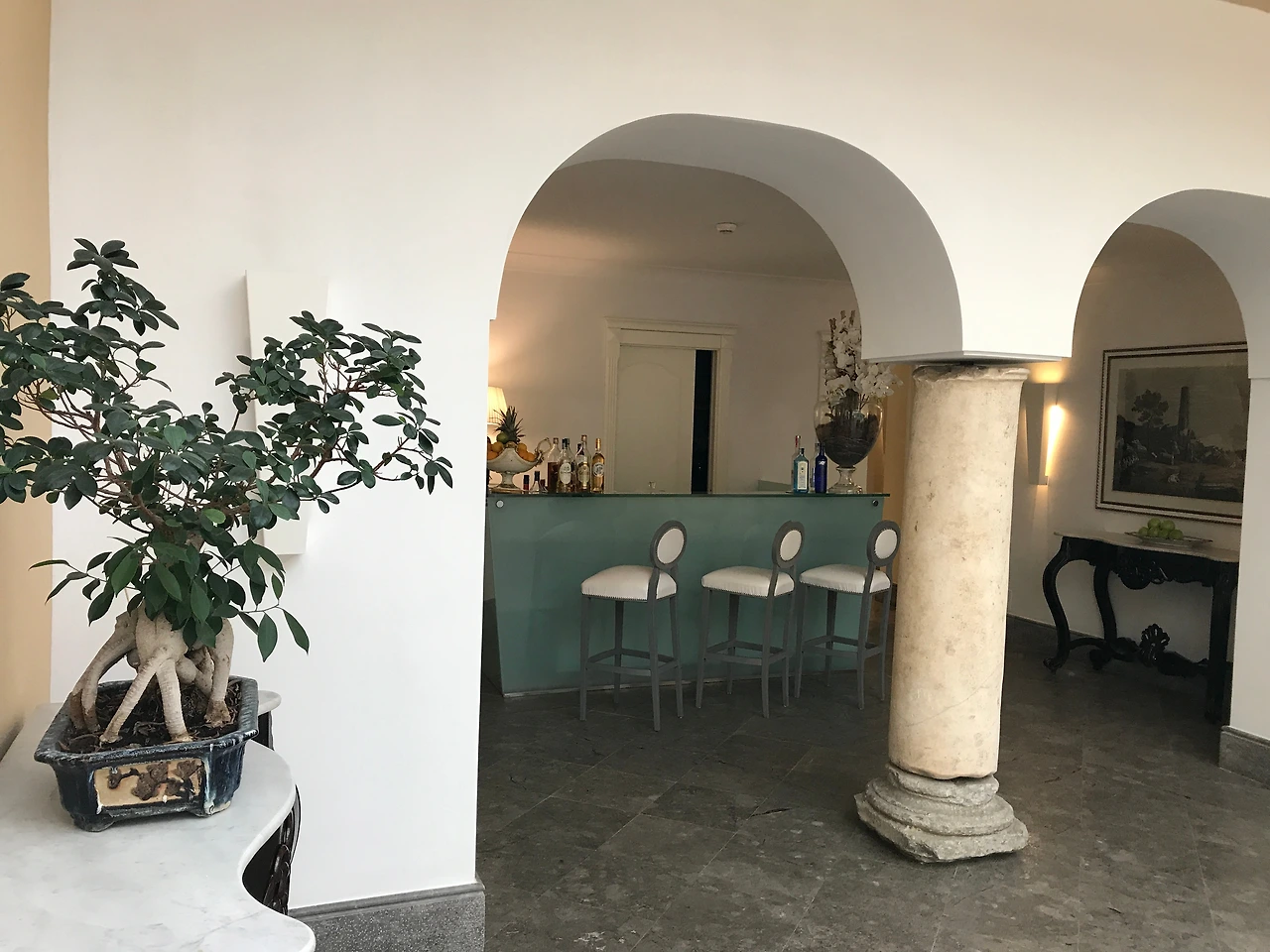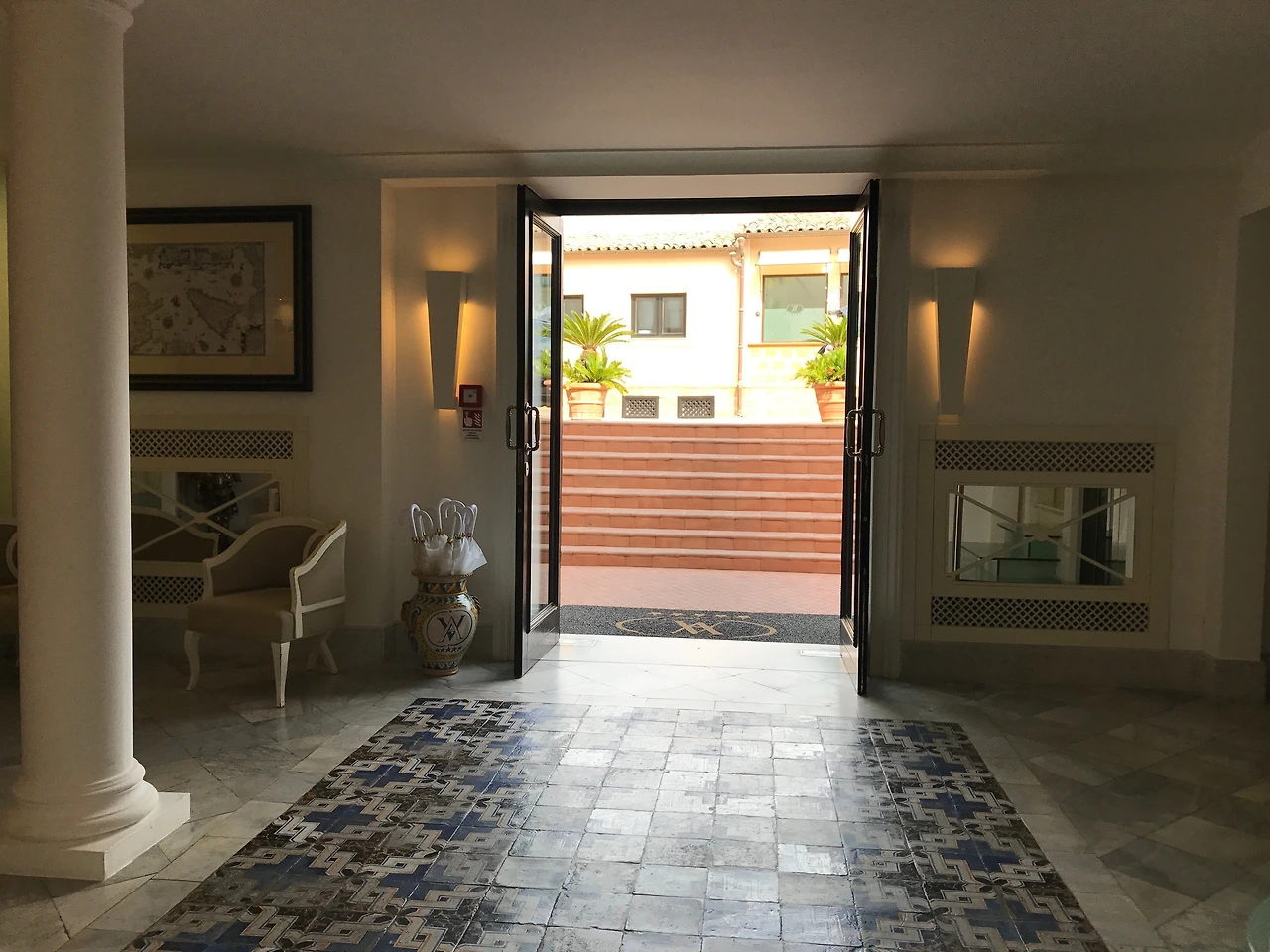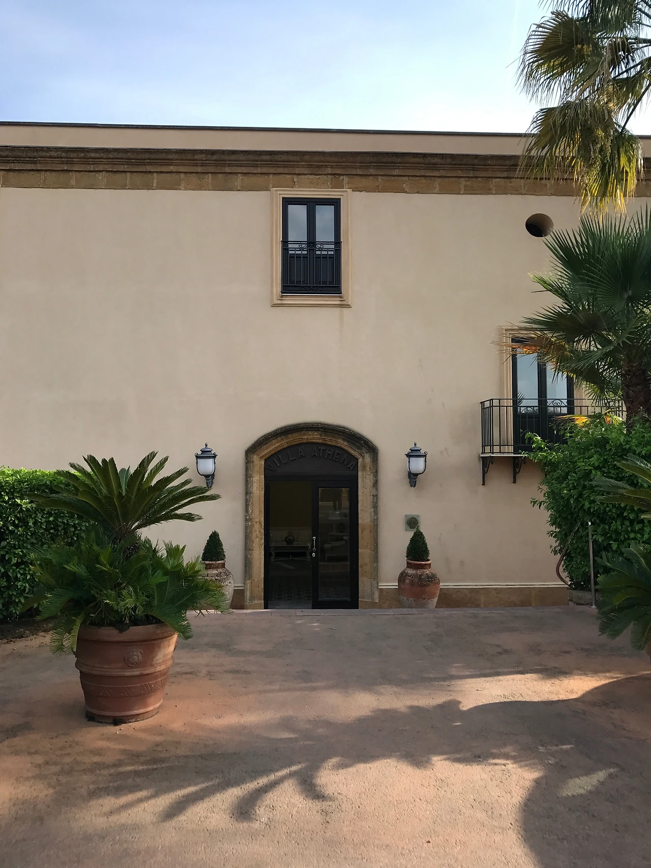 휴양지 느낌과 클래식한 느낌이 공존하는 호텔 빌라 아테네의 입구